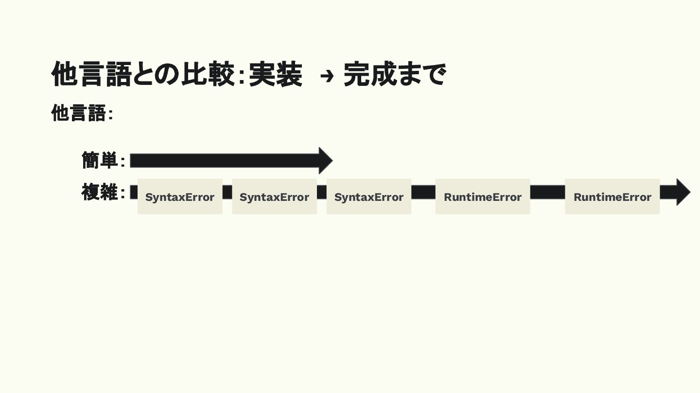 他言語との比較:実装 → 完成まで 簡単: 複雑: 他言語: SyntaxError RuntimeError RuntimeError SyntaxError