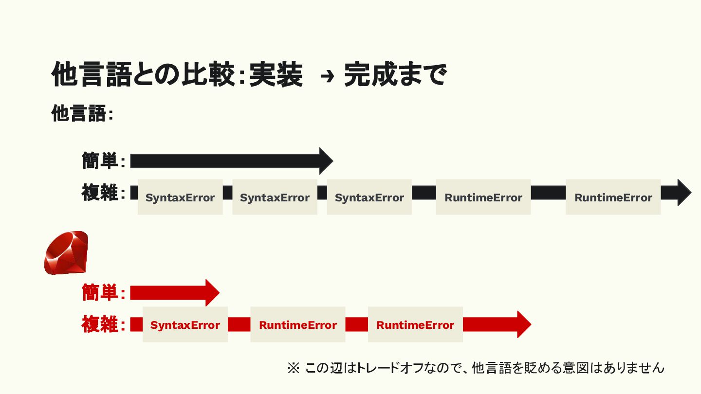 他言語との比較:実装 → 完成まで 簡単: 複雑: SyntaxError RuntimeError RuntimeError 簡単: 複雑: