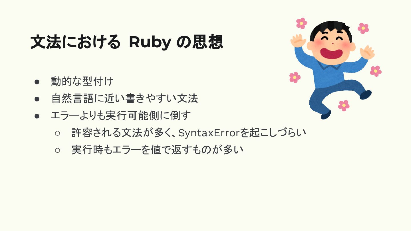 • 動的な型付け • 自然言語に近い書きやすい文法 • エラーよりも実行可能側に倒す ◦ 許容される文法が多く、SyntaxErrorを起こしづらい ◦ 実行時もエラーを値で返すものが多い
