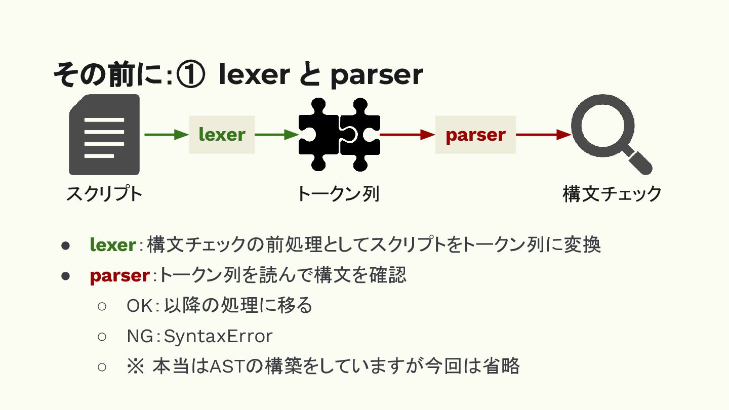 lexer:構文チェックの前処理としてスクリプトをトークン列に変換 • parser:トークン列を読んで構文を確認 ◦ OK:以降の処理に移る ◦ NG:SyntaxError ◦ ※ 本当はASTの構築をしていますが今回は省略