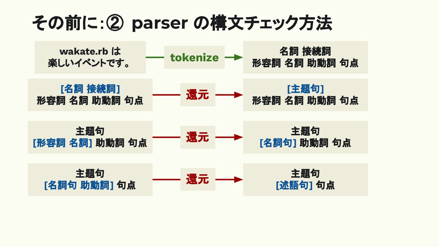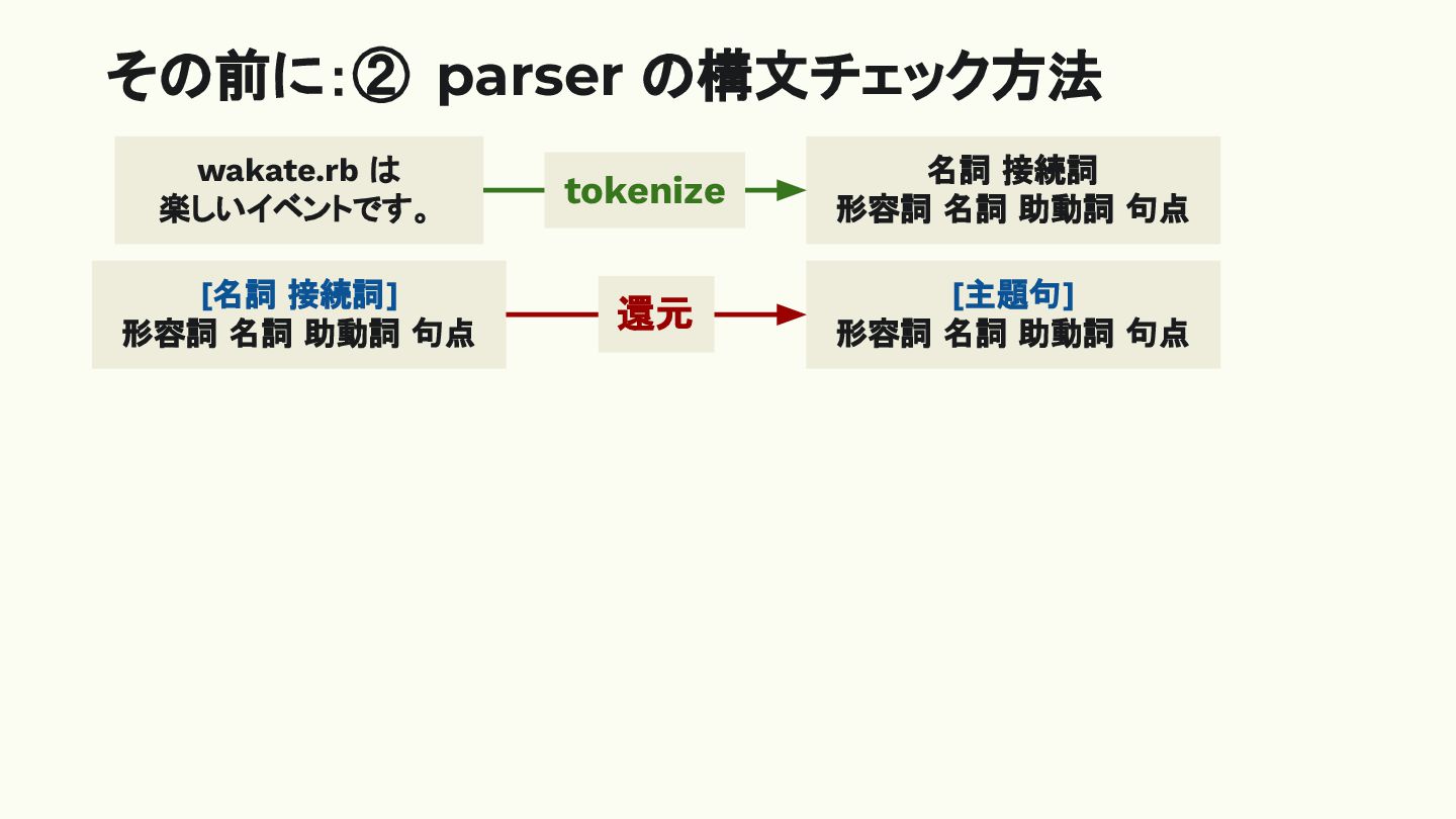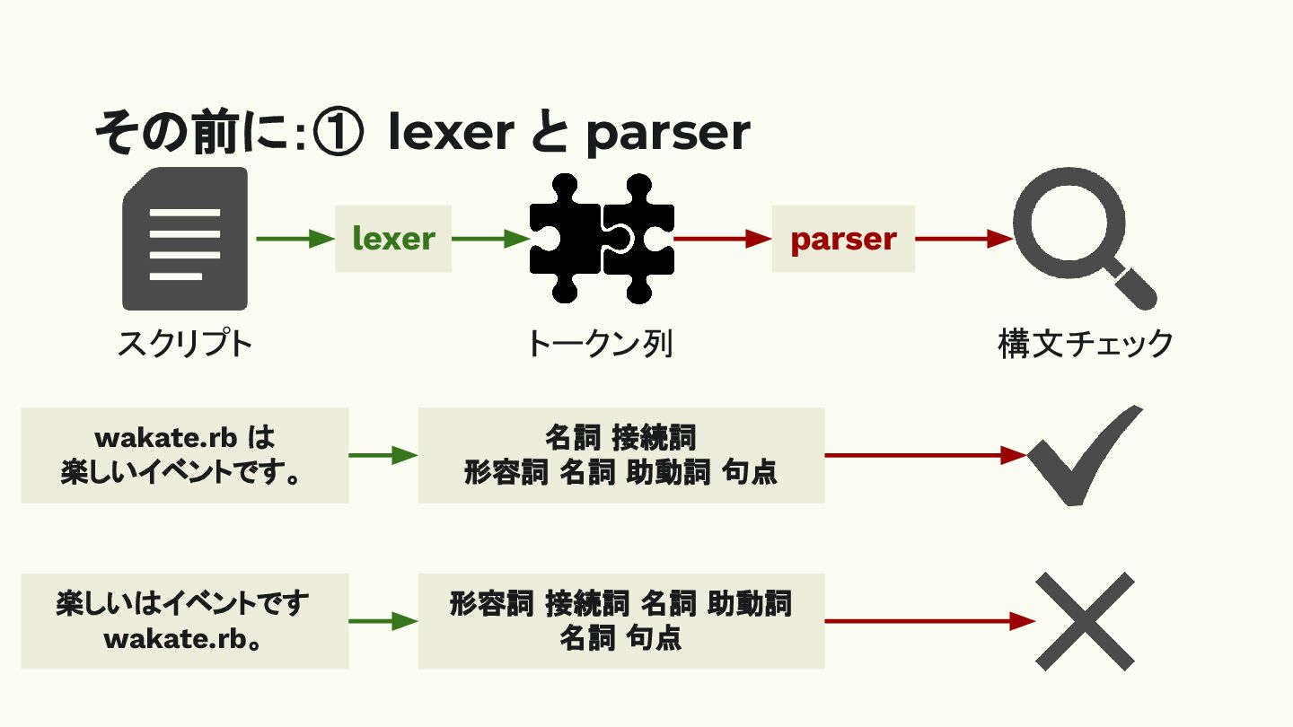 その前に:① lexer と parser wakate.rb は 楽しいイベントです。 名詞 接続詞 形容詞