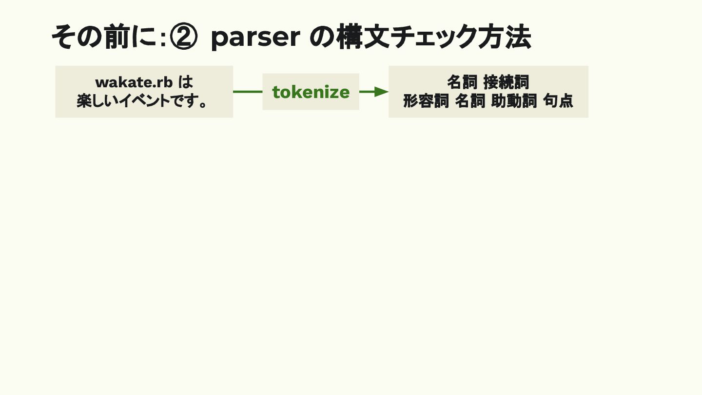 名詞 助動詞 句点 楽しいはイベントです wakate.rb。 形容詞 接続詞 名詞 助動詞 名詞 句点 lexer parser スクリプト トークン列 構文チェック
