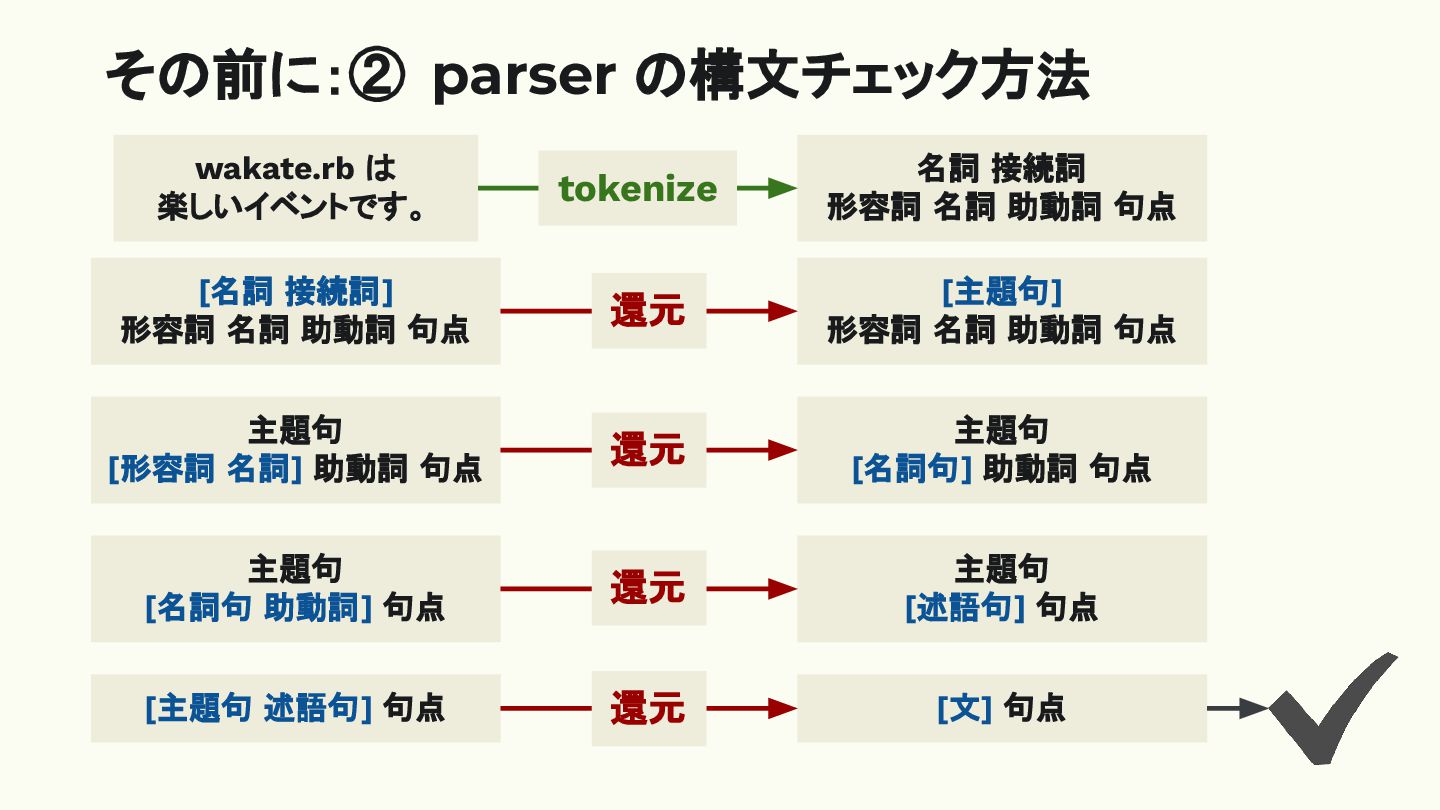 その前に:② parser の構文チェック方法 wakate.rb は 楽しいイベントです。 名詞 接続詞 形容詞 名詞