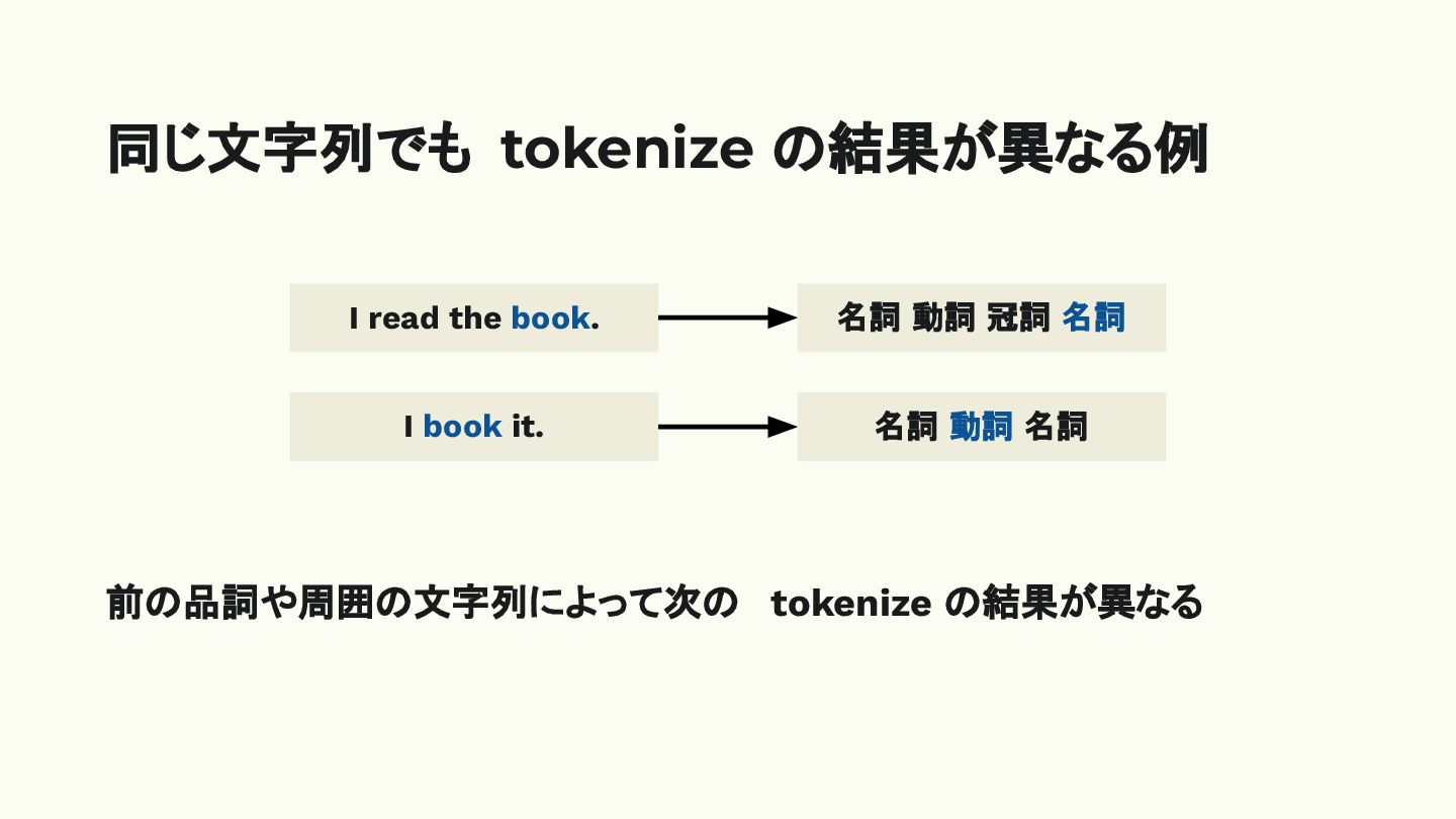 名詞 I book it. 名詞 動詞 名詞 前の品詞や周囲の文字列によって次の tokenize の結果が異なる