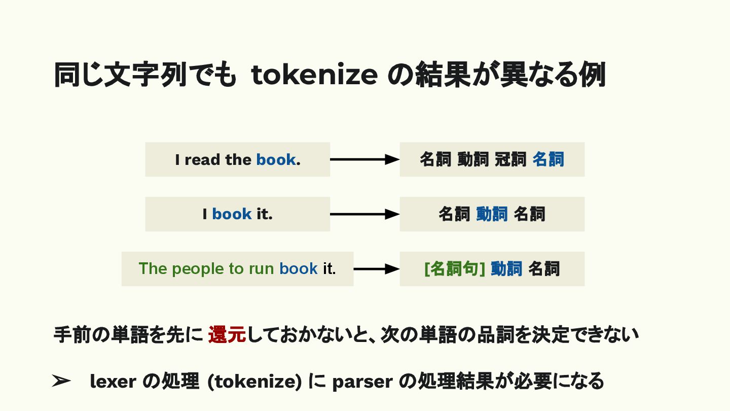 名詞 I book it. 名詞 動詞 名詞 手前の単語を先に 還元しておかないと、次の単語の品詞を決定できない ➢ lexer の処理 (tokenize) に parser の処理結果が必要になる The people to run book it. [名詞句] 動詞 名詞