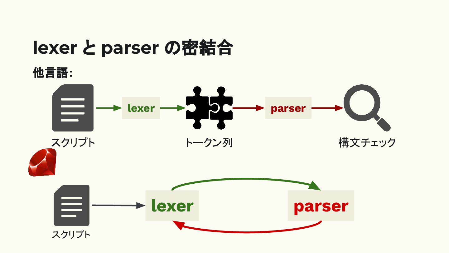 と parser の密結合 lexer parser tokenize 状態の更新 還元 状態の更新 スクリプト