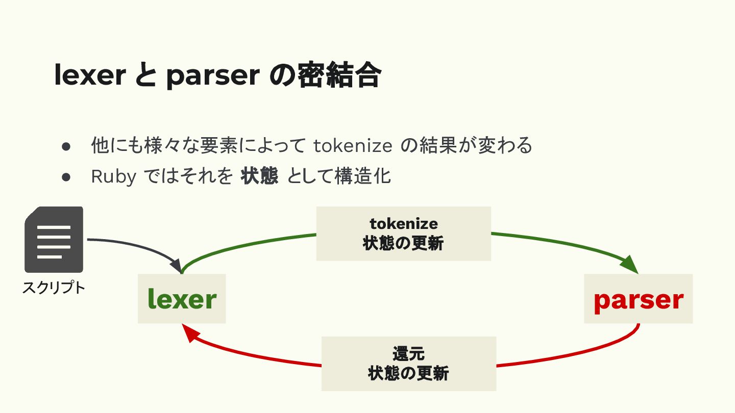 • 他にも様々な要素によって tokenize の結果が変わる • Ruby ではそれを 状態 として構造化 lexer