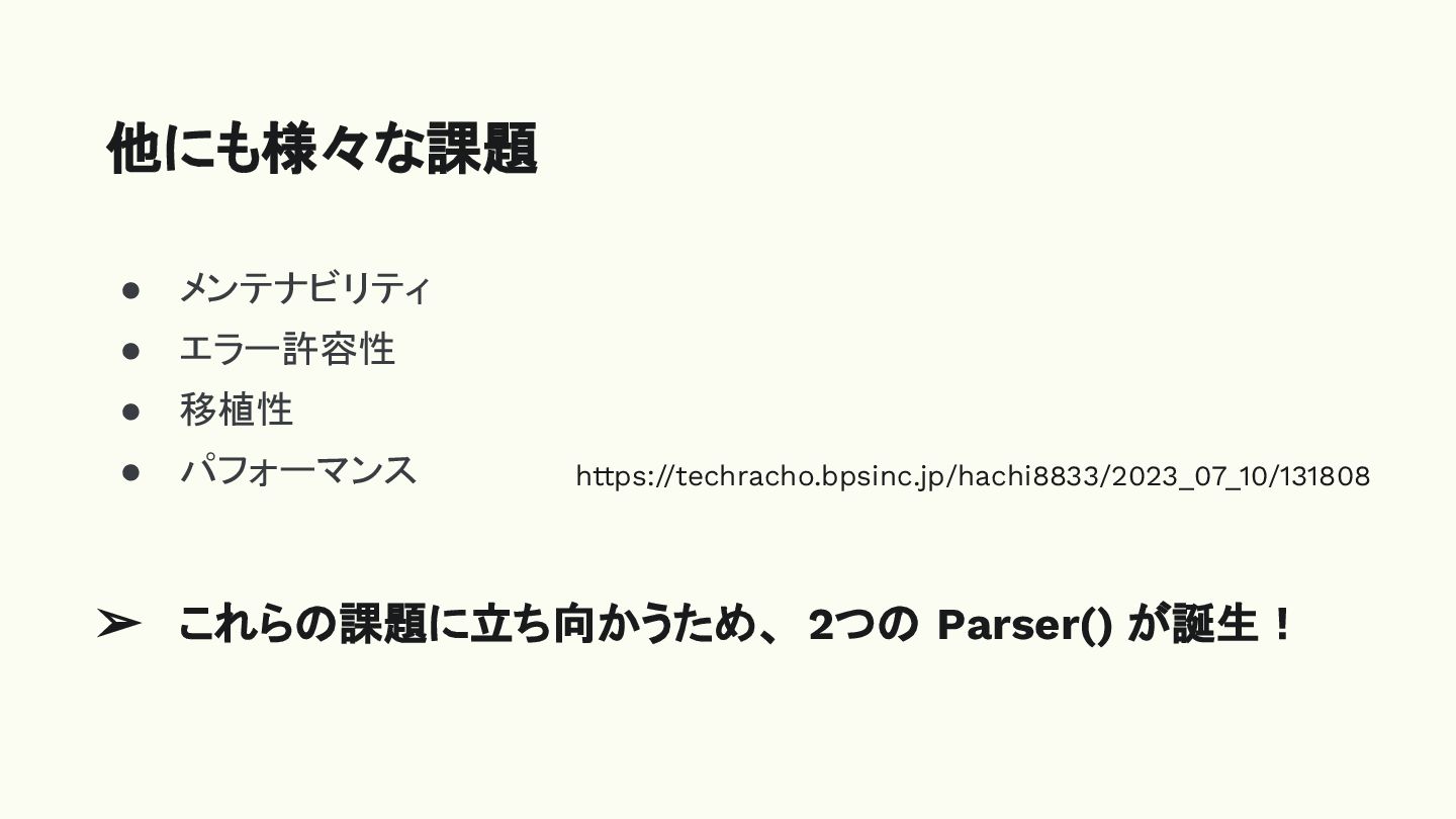 ➢ これらの課題に立ち向かうため、 2つの Parser() が誕生!