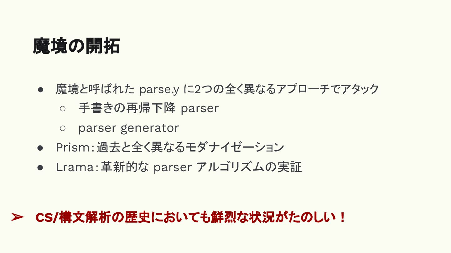 • Prism:過去と全く異なるモダナイゼーション • Lrama:革新的な parser アルゴリズムの実証 魔境の開拓 ➢ CS/構文解析の歴史においても鮮烈な状況がたのしい!