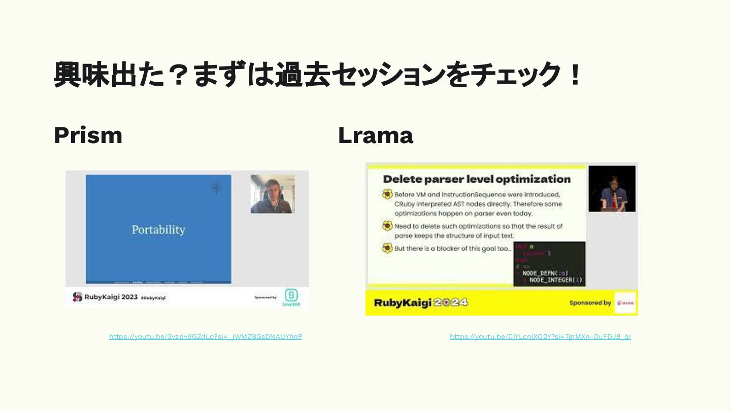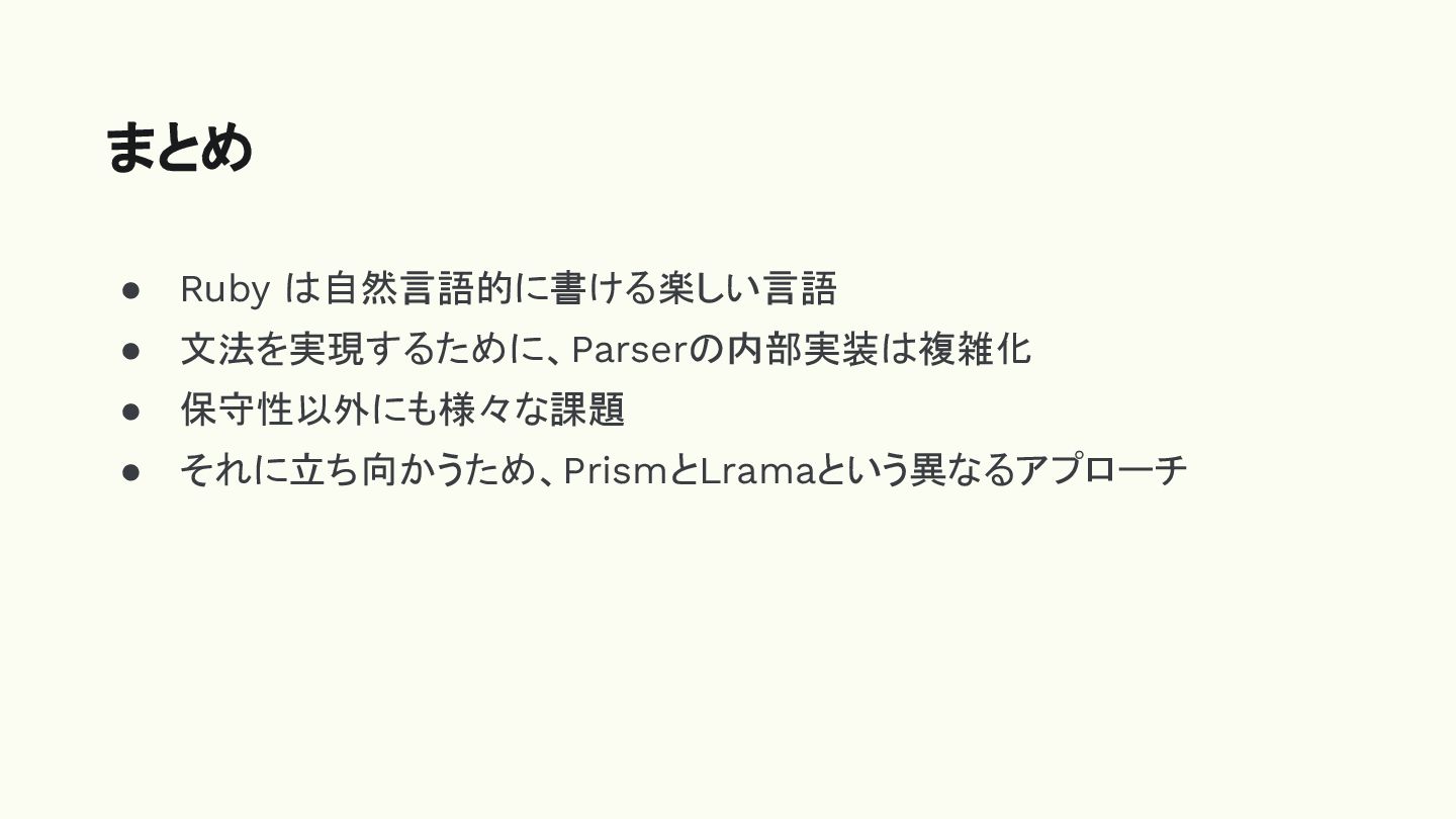 • Ruby は自然言語的に書ける楽しい言語 • 文法を実現するために、Parserの内部実装は複雑化 • 保守性以外にも様々な課題 • それに立ち向かうため、PrismとLramaという異なるアプローチ まとめ