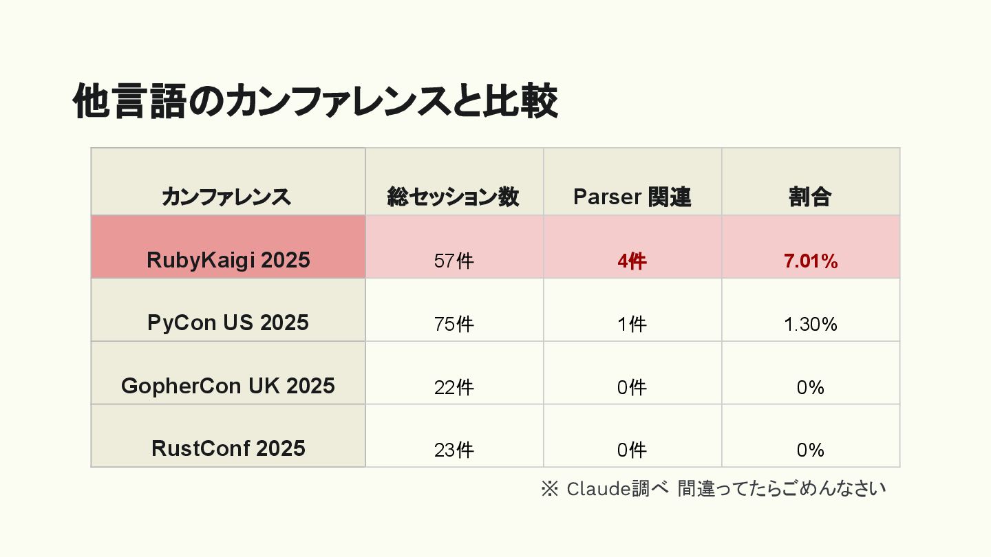 他言語のカンファレンスと比較 カンファレンス 総セッション数 Parser 関連 割合 RubyKaigi 2025 57件 4件