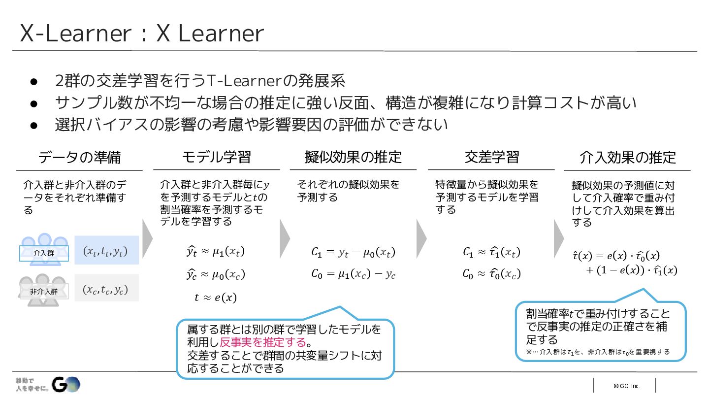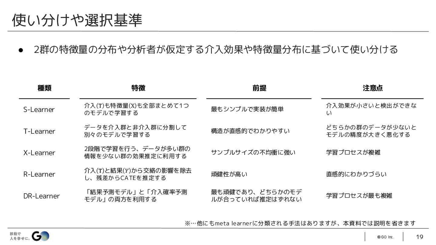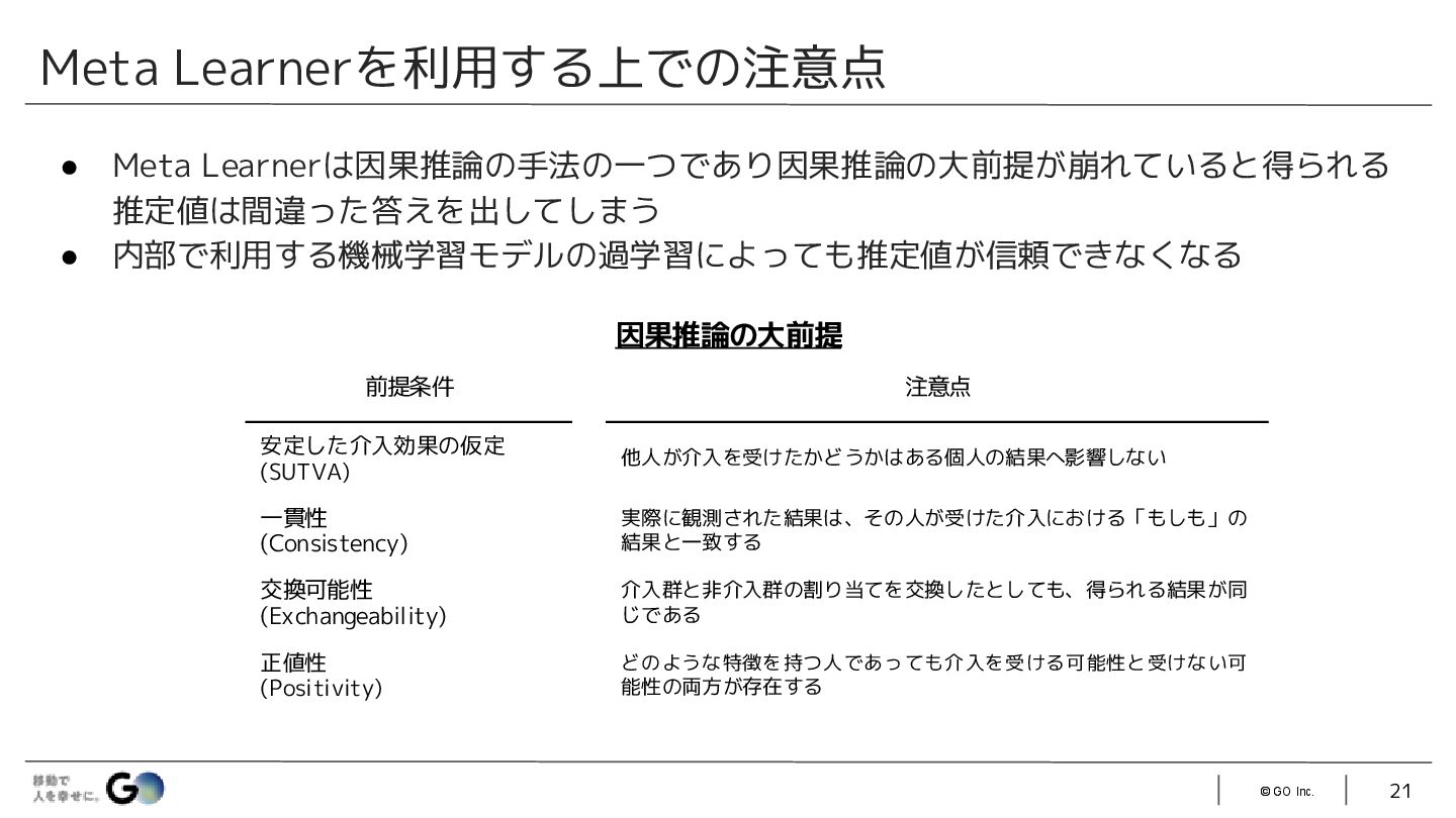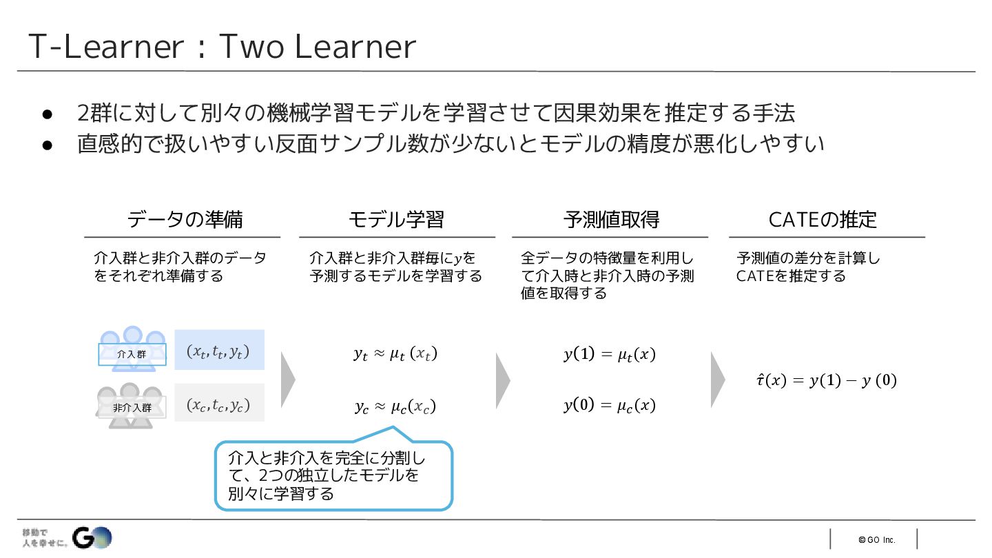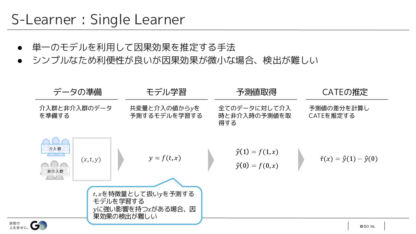 ただし、全体のサンプル数が少ないと予測精度が不安定になる場合がある Meta Learnerによる因果推論 13 𝑌 ≈ መ 𝑓(𝑡, 𝑥) モデル学習 𝑌 1 = መ 𝑓 𝑇 = 1, 𝑋 = 𝑥 𝑌 0 = መ 𝑓(𝑇 = 0, 𝑋 = 𝑥) Ƹ 𝜏(𝑥) = 𝑌 1 − 𝑌 0 データの準備 予測値取得 CATEの推定 ※…一部の手法では若干手順が異なる場合がある (𝑥𝑐 , 𝑡𝑐 , 𝑦𝑐 ) (𝑥𝑡 , 𝑡𝑡 , 𝑦𝑡 ) 介入群 非介入群 Meta Learnerによる因果効果の推定手順