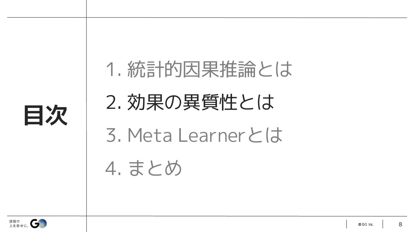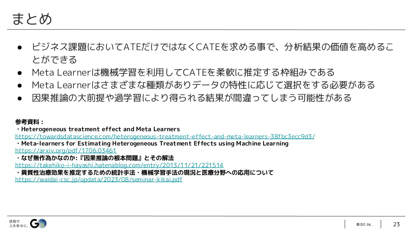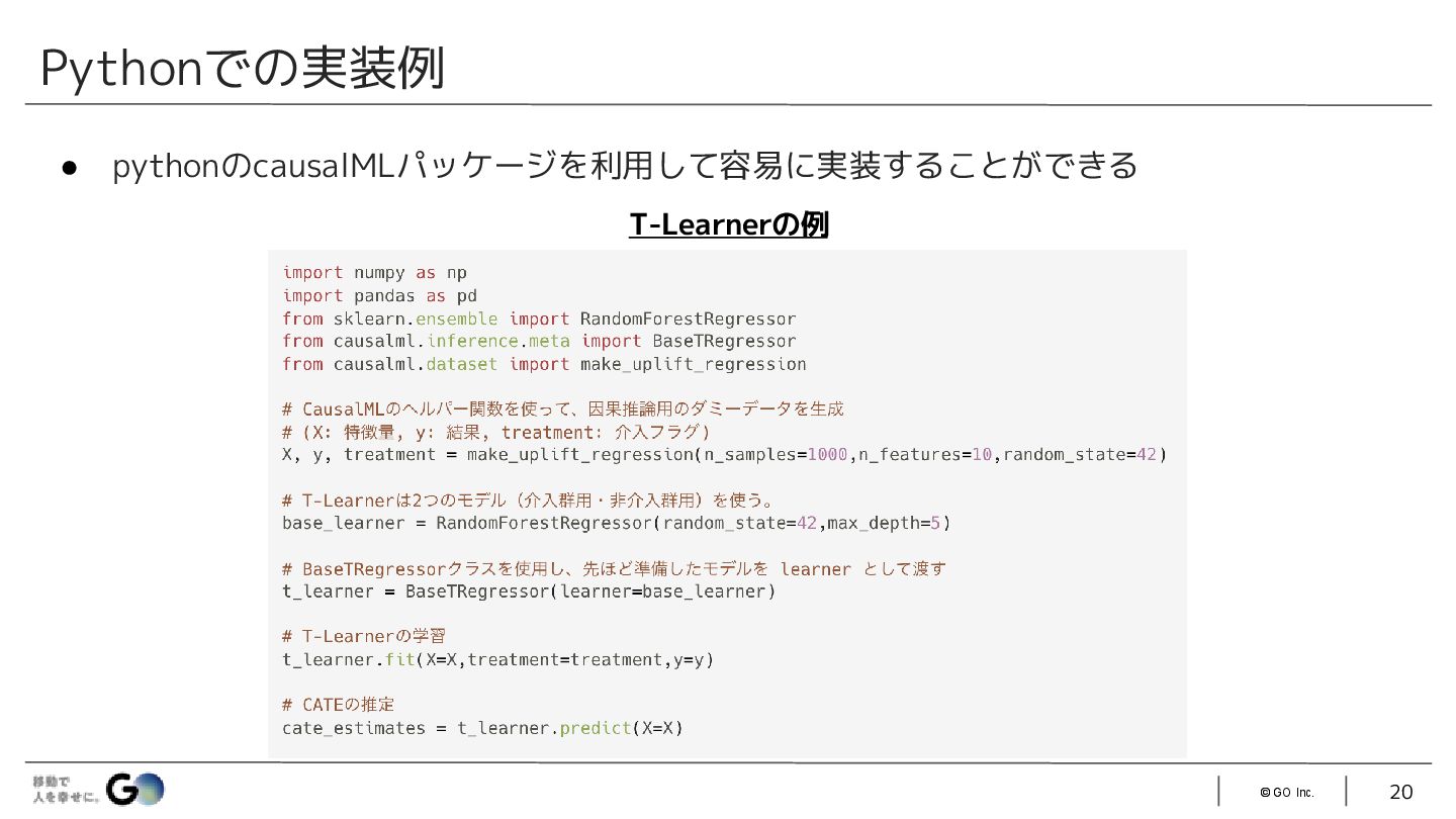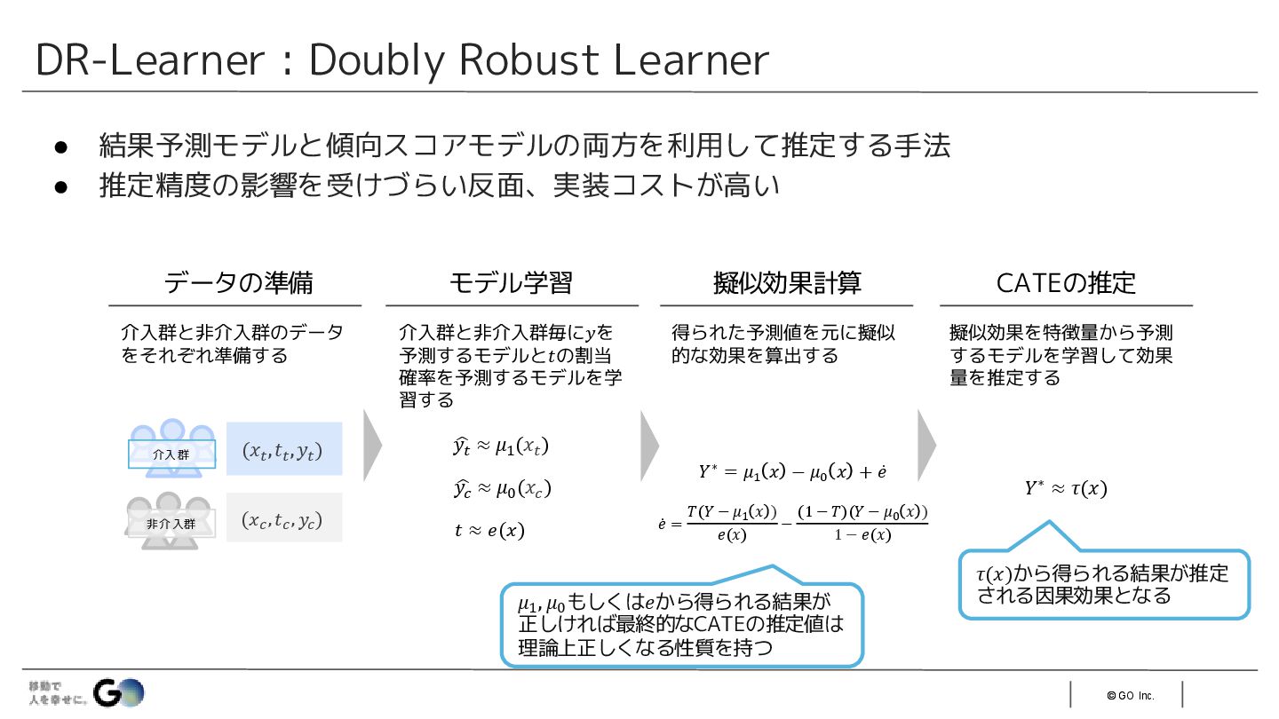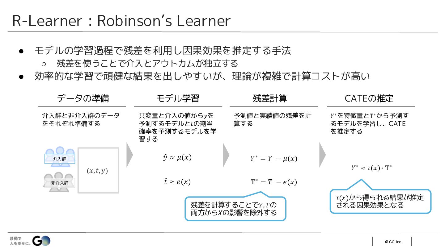 ただし、全体のサンプル数が少ないと予測精度が不安定になる場合がある Meta Learnerによる因果推論 13 𝑌 ≈ መ 𝑓(𝑡, 𝑥) モデル学習 𝑌 1 = መ 𝑓 𝑇 = 1, 𝑋 = 𝑥 𝑌 0 = መ 𝑓(𝑇 = 0, 𝑋 = 𝑥) Ƹ 𝜏(𝑥) = 𝑌 1 − 𝑌 0 データの準備 予測値取得 CATEの推定 ※…一部の手法では若干手順が異なる場合がある (𝑥𝑐 , 𝑡𝑐 , 𝑦𝑐 ) (𝑥𝑡 , 𝑡𝑡 , 𝑦𝑡 ) 介入群 非介入群 Meta Learnerによる因果効果の推定手順