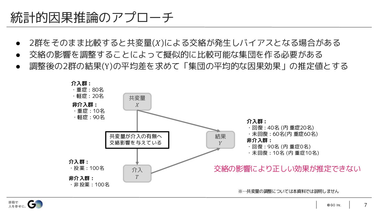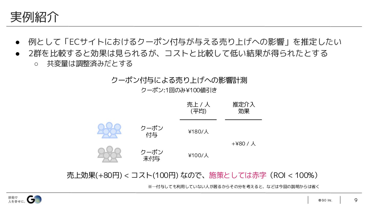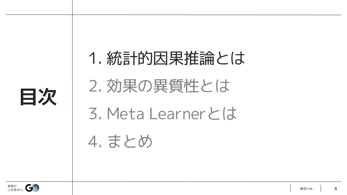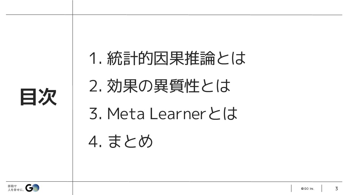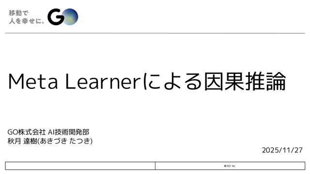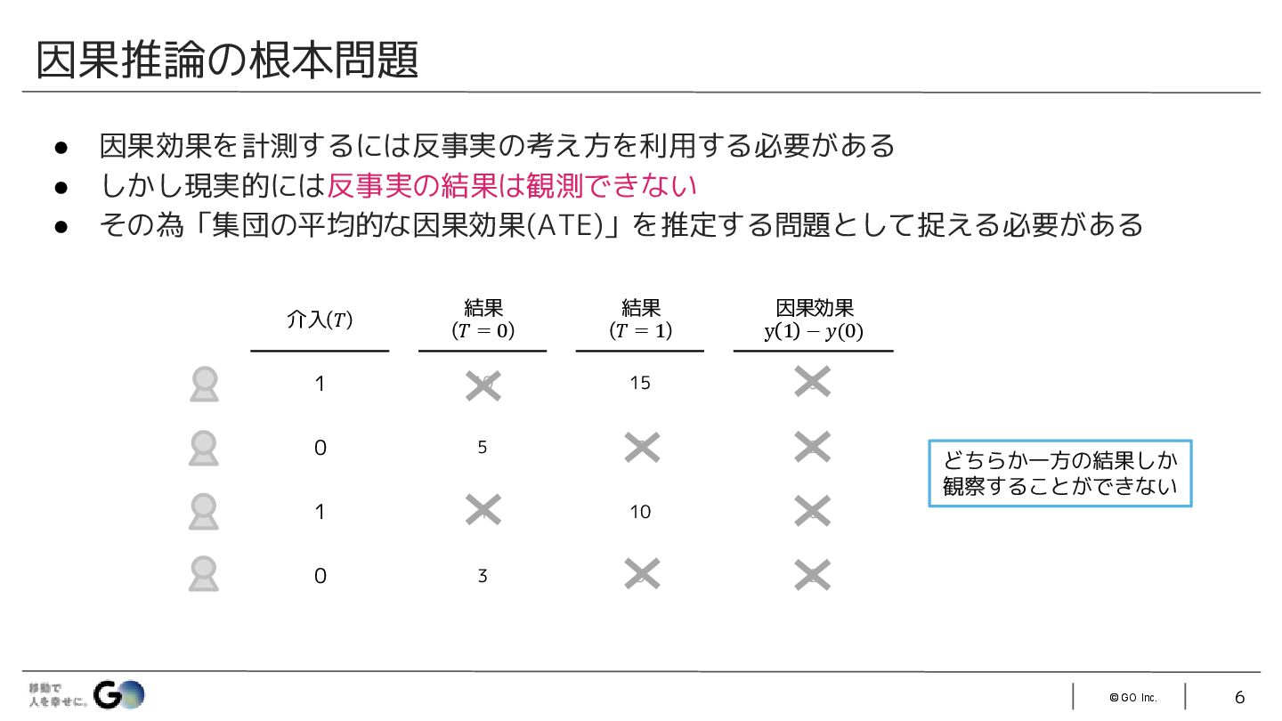 ただし、全体のサンプル数が少ないと予測精度が不安定になる場合がある Meta Learnerによる因果推論 13 𝑌 ≈ መ 𝑓(𝑡, 𝑥) モデル学習 𝑌 1 = መ 𝑓 𝑇 = 1, 𝑋 = 𝑥 𝑌 0 = መ 𝑓(𝑇 = 0, 𝑋 = 𝑥) Ƹ 𝜏(𝑥) = 𝑌 1 − 𝑌 0 データの準備 予測値取得 CATEの推定 ※…一部の手法では若干手順が異なる場合がある (𝑥𝑐 , 𝑡𝑐 , 𝑦𝑐 ) (𝑥𝑡 , 𝑡𝑡 , 𝑦𝑡 ) 介入群 非介入群 Meta Learnerによる因果効果の推定手順