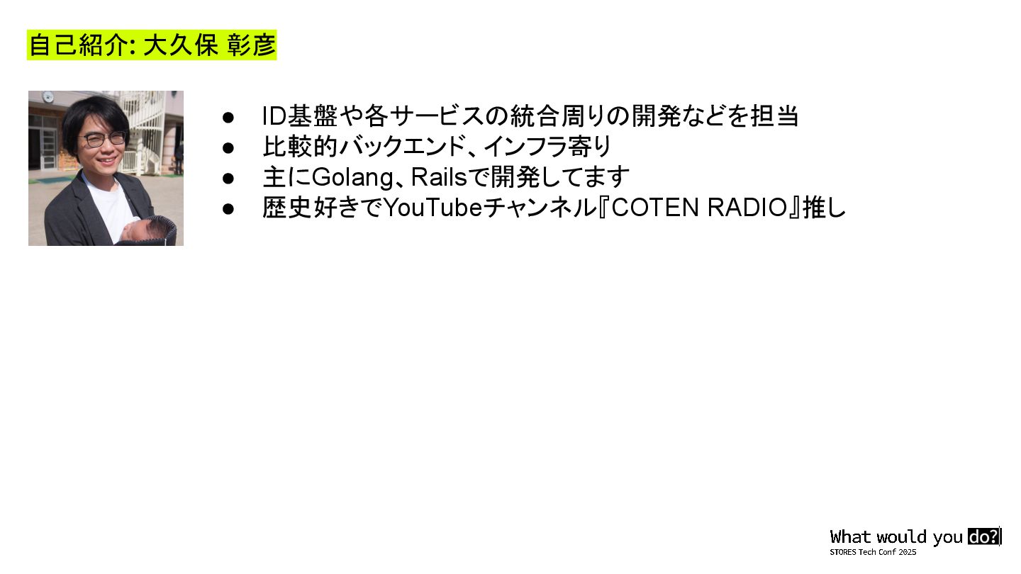 自己紹介: 大久保 彰彦 • ID基盤や各サービスの統合周りの開発などを担当 • 比較的バックエンド、インフラ寄り • 主にGolang、Railsで開発してます •