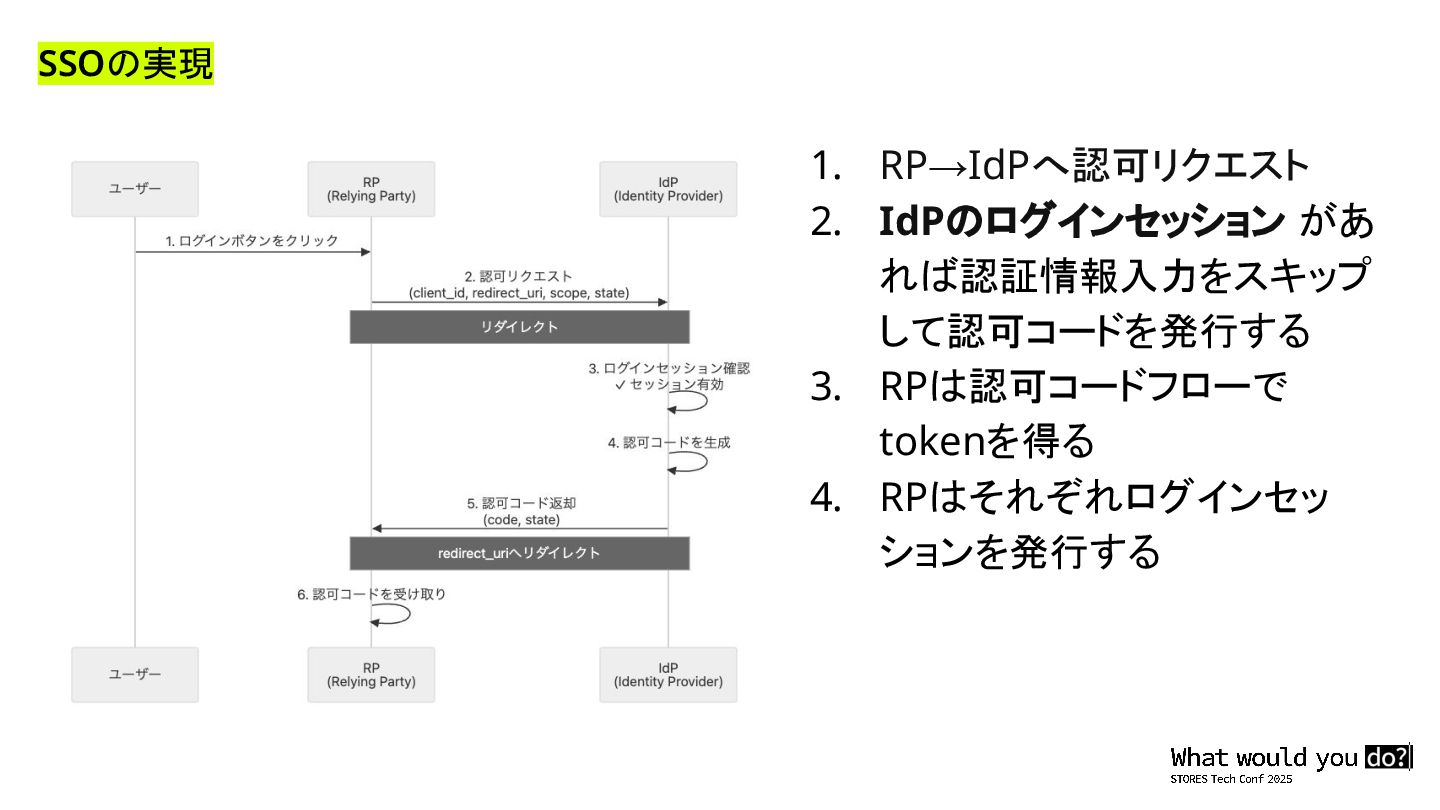 SSOの実現 1. RP→IdPへ認可リクエスト 2. IdPのログインセッション があ れば認証情報入力をスキップ して認可コードを発行する 3. RPは認可コードフローで