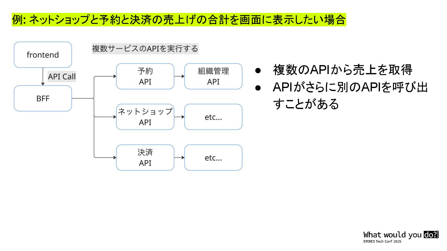 • 複数のAPIから売上を取得 • APIがさらに別のAPIを呼び出 すことがある 例: ネットショップと予約と決済の売上げの合計を画面に表示したい場合