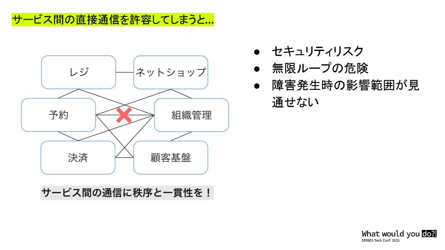 • セキュリティリスク • 無限ループの危険 • 障害発生時の影響範囲が見 通せない サービス間の直接通信を許容してしまうと...