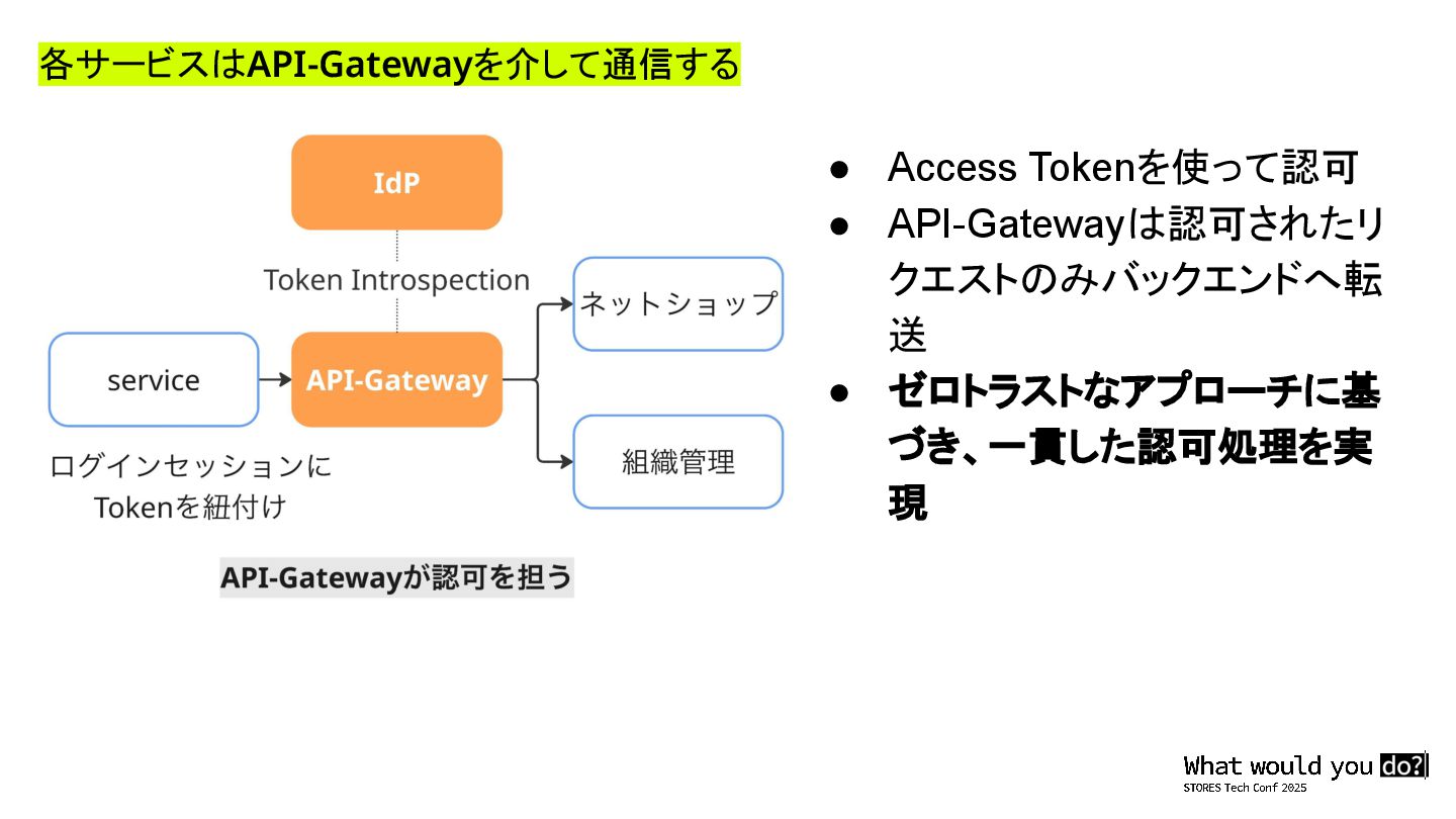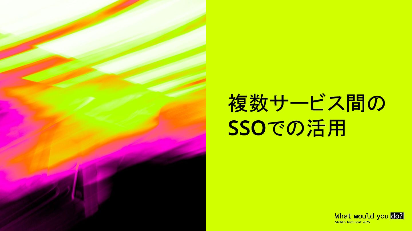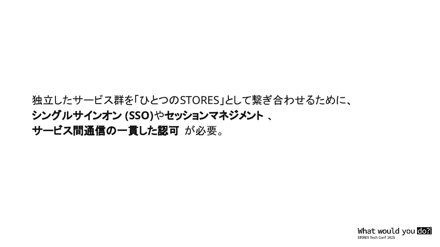 独立したサービス群を「ひとつのSTORES」として繋ぎ合わせるために、 シングルサインオン (SSO)やセッションマネジメント 、 サービス間通信の一貫した認可 が必要。