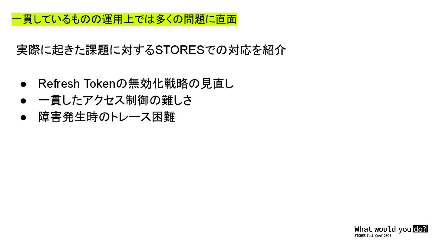 一貫しているものの運用上では多くの問題に直面 実際に起きた課題に対するSTORESでの対応を紹介 • Refresh Tokenの無効化戦略の見直し • 一貫したアクセス制御の難しさ • 障害発生時のトレース困難