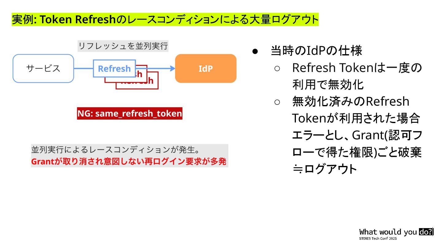 実例: Token Refreshのレースコンディションによる大量ログアウト • 当時のIdPの仕様 ◦ Refresh Tokenは一度の 利用で無効化 ◦