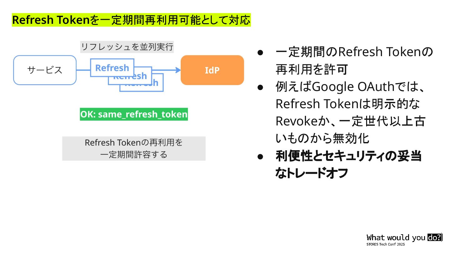 Refresh Tokenを一定期間再利用可能として対応 • 一定期間のRefresh Tokenの 再利用を許可 • 例えばGoogle OAuthでは、 Refresh