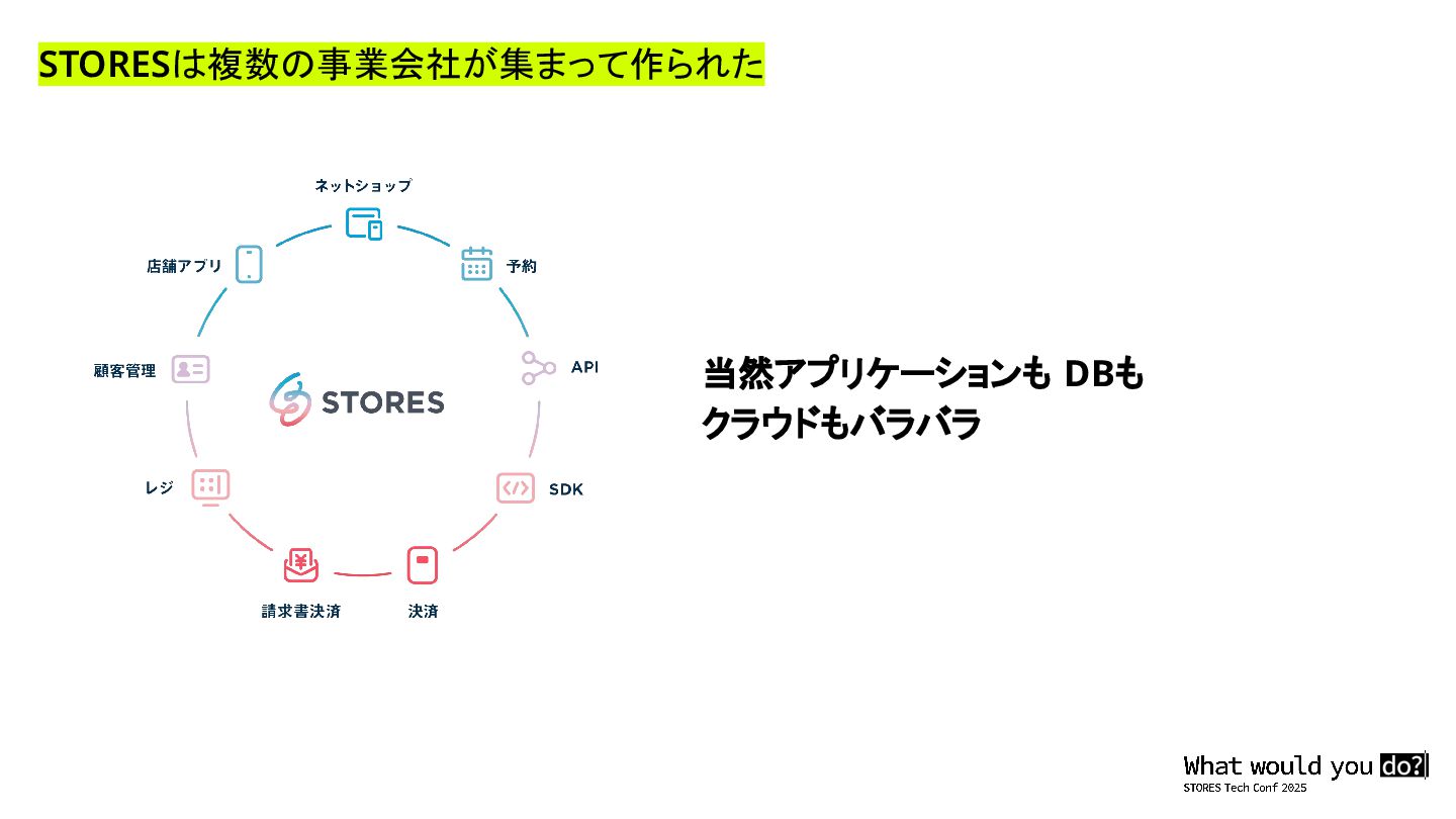 STORESは複数の事業会社が集まって作られた 当然アプリケーションも DBも クラウドもバラバラ