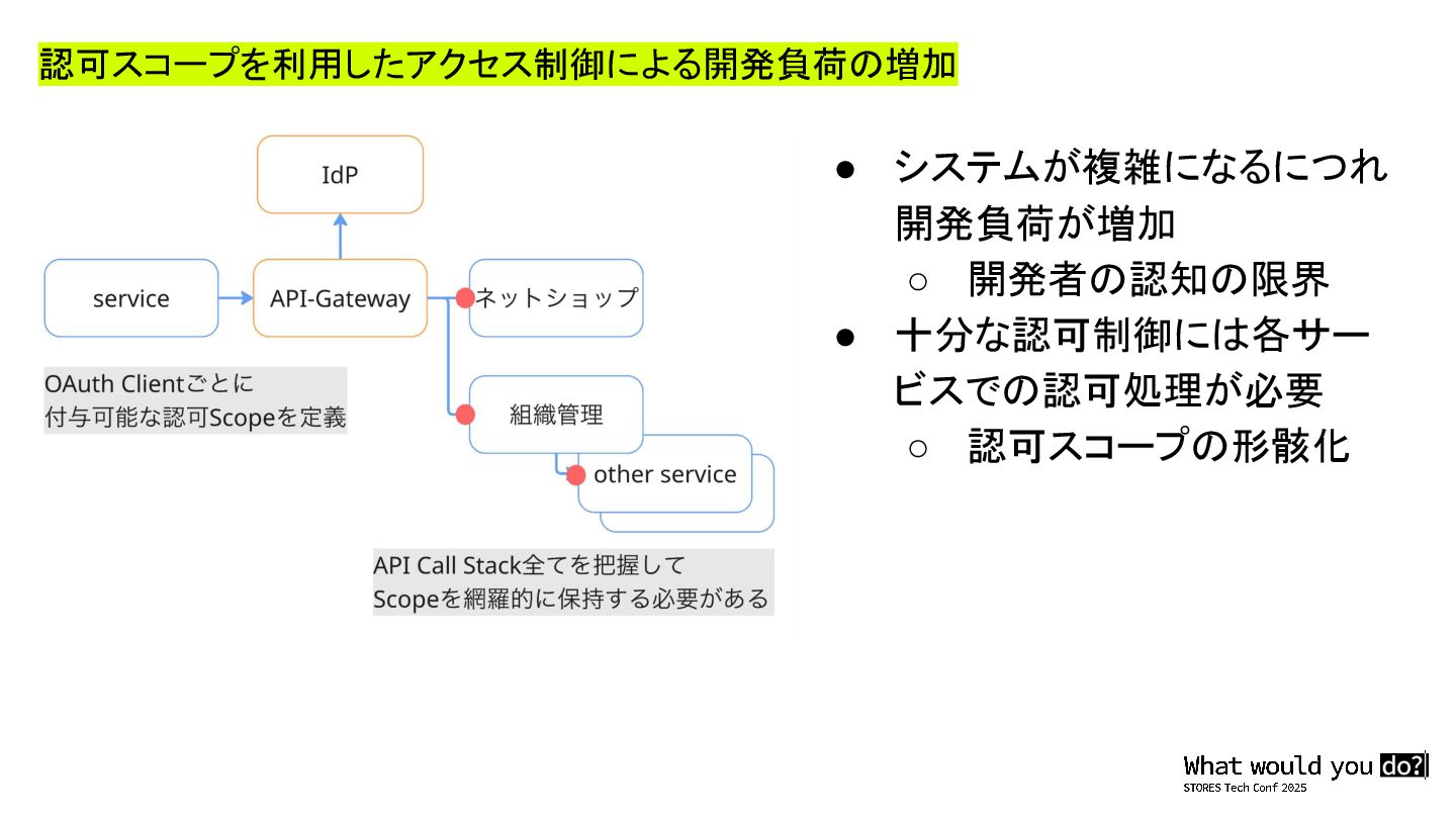 認可スコープを利用したアクセス制御による開発負荷の増加 • システムが複雑になるにつれ 開発負荷が増加 ◦ 開発者の認知の限界 • 十分な認可制御には各サー ビスでの認可処理が必要 ◦