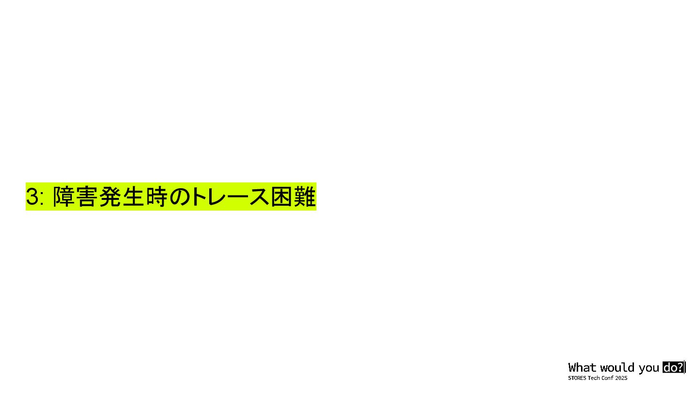 あるAPIを呼び出した時に、 「internal_server_error」というレスポンスが返りました。 呼び出し先のAPIのログを確認すると、また別のAPI呼び出しでの エラーログを見つけました。 原因に辿り着くまでこれを繰り返すことに耐えられますか?