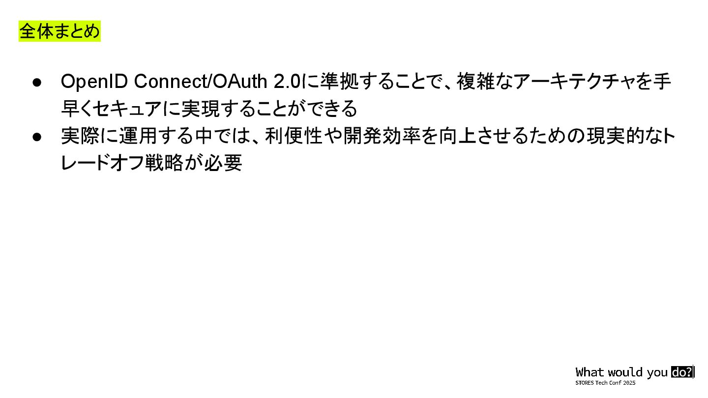 全体まとめ • OpenID Connect/OAuth 2.0に準拠することで、複雑なアーキテクチャを手 早くセキュアに実現することができる • 実際に運用する中では、利便性や開発効率を向上させるための現実的なト レードオフ戦略が必要