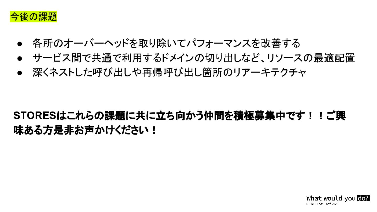 今後の課題 • 各所のオーバーヘッドを取り除いてパフォーマンスを改善する • サービス間で共通で利用するドメインの切り出しなど、リソースの最適配置 • 深くネストした呼び出しや再帰呼び出し箇所のリアーキテクチャ STORESはこれらの課題に共に立ち向かう仲間を積極募集中です!!ご興 味ある方是非お声かけください!