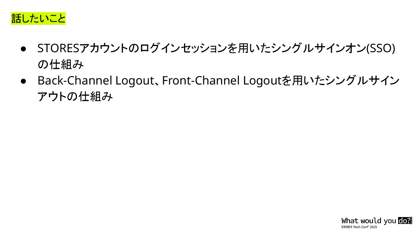 話したいこと • STORESアカウントのログインセッションを用いたシングルサインオン(SSO) の仕組み • Back-Channel Logout、Front-Channel Logoutを用いたシングルサイン アウトの仕組み