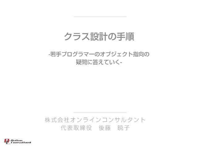 <対象> ・プログラミングを始めて3年以上 ・オブジェクト指向でプログラミングをしている ・クラス設計などを担当するようになったが、設計とはどうすればよいのかわからない ・なんだか設計が後一歩と感じる
