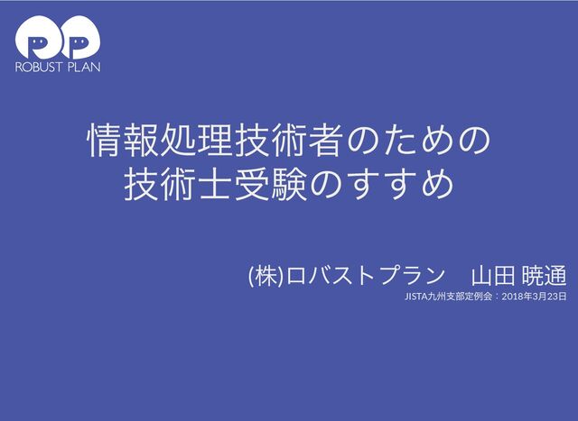 情報処理技術者のための 情報処理技術者のための 技術士受験のすすめ 技術士受験のすすめ ( 株) ロバストプラン 山田 暁通 JISTA 九州支部定例会:2018