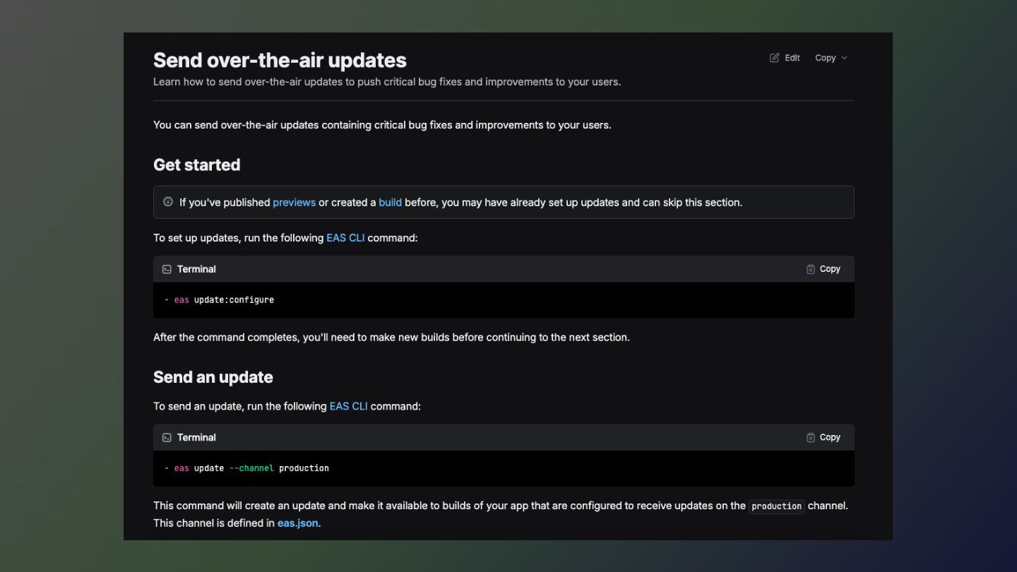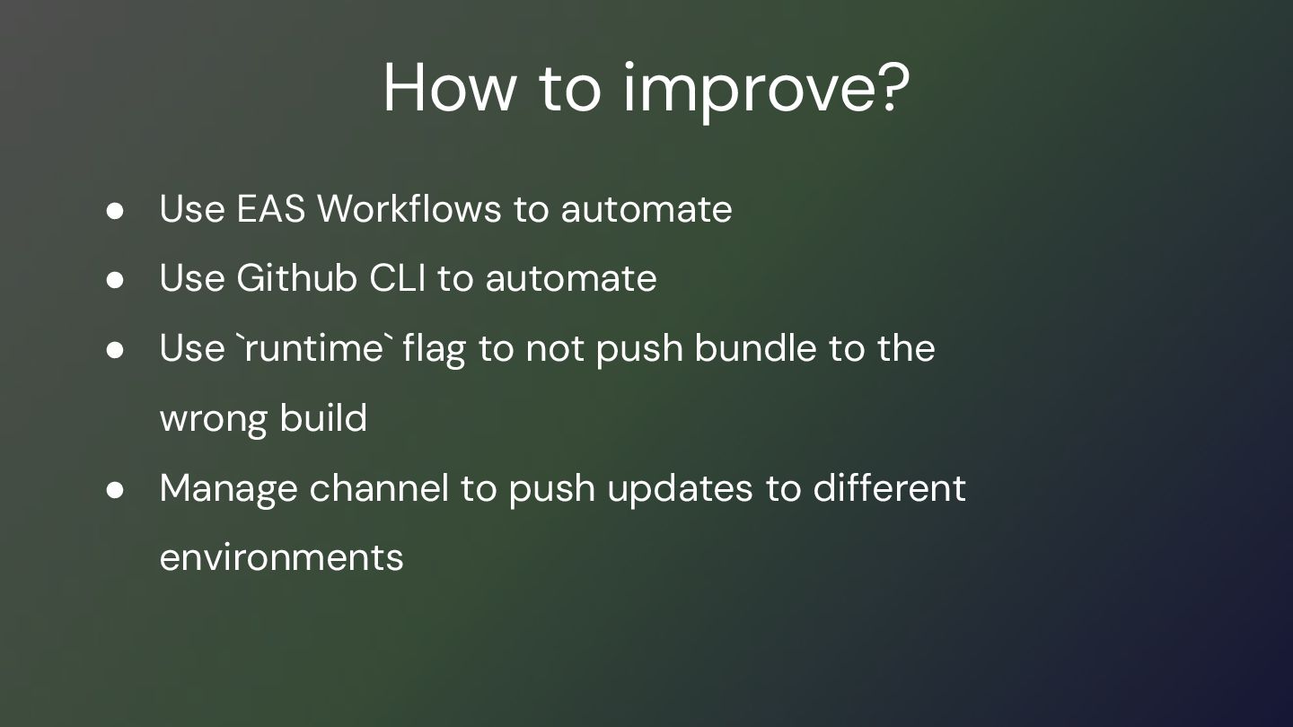 Use Github CLI to automate • Use `runtime` flag to not push bundle to the wrong build • Manage channel to push updates to different environments