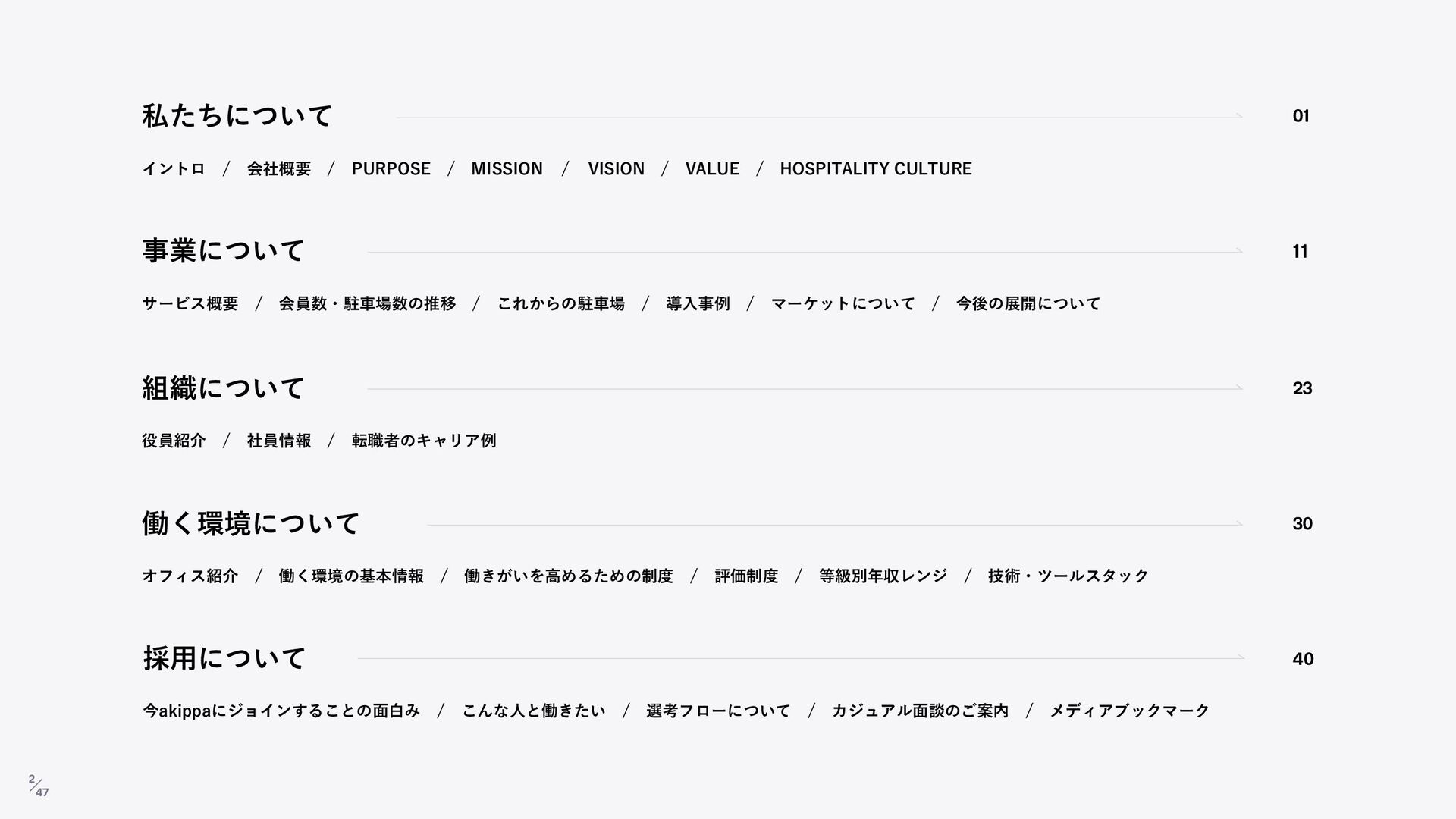1. 私たちについて イントロ / 会社概要 / PURPOSE / MISSION / VISION / VALUE / HOSPITALITY CULTURE 事業について サービス概要 / 会員数・駐車場数の推移 / これからの駐車場 / 導入事例 / マーケットについて / 今後の展開について 組織について 役員紹介 / 社員情報 / 転職者のキャリア例 働く環境について