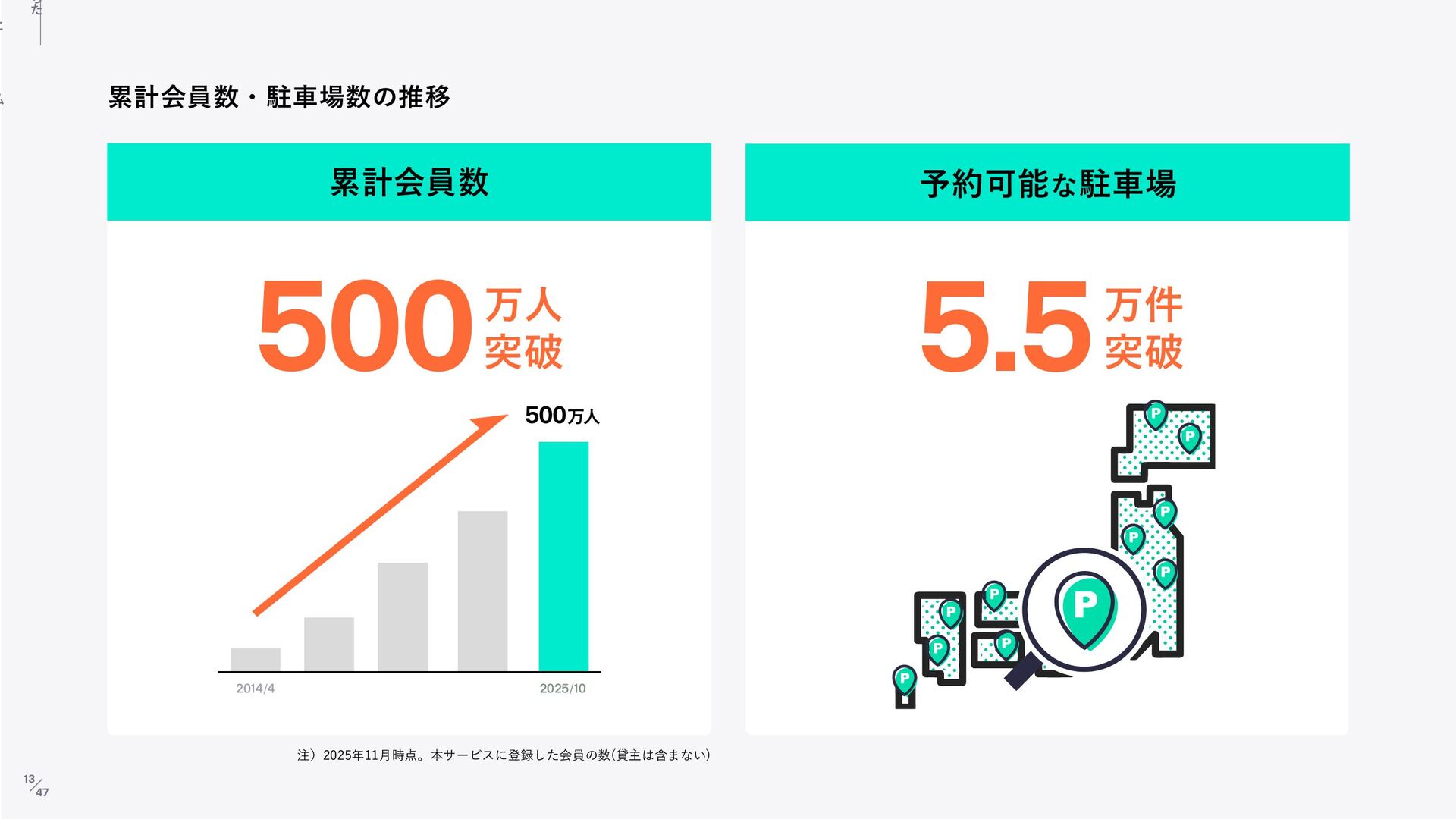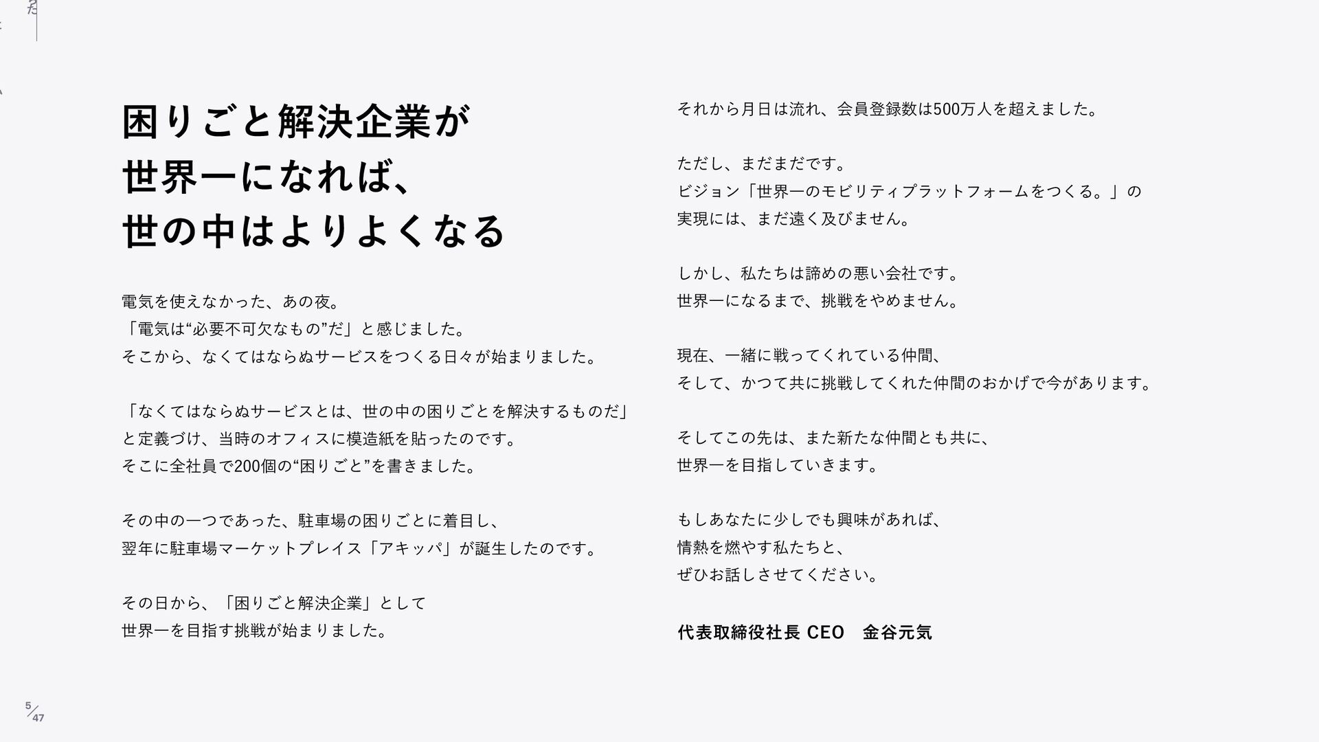 そこに全社員で200個の“困りごと”を書きました。 その中の一つであった、駐車場の困りごとに着目し、 翌年に駐車場マーケットプレイス「アキッパ」が誕生したのです。 その日から、「困りごと解決企業」として 世界一を目指す挑戦が始まりました。 それから月日は流れ、会員登録数は500万人を超えました。 ただし、まだまだです。 ビジョン「世界一のモビリティプラットフォームをつくる。」の 実現には、まだ遠く及びません。 しかし、私たちは諦めの悪い会社です。 世界一になるまで、挑戦をやめません。 現在、一緒に戦ってくれている仲間、 そして、かつて共に挑戦してくれた仲間のおかげで今があります。 そしてこの先は、また新たな仲間とも共に、 世界一を目指していきます。 もしあなたに少しでも興味があれば、 情熱を燃やす私たちと、 ぜひお話しさせてください。 5 47 私 た ち に つ い て