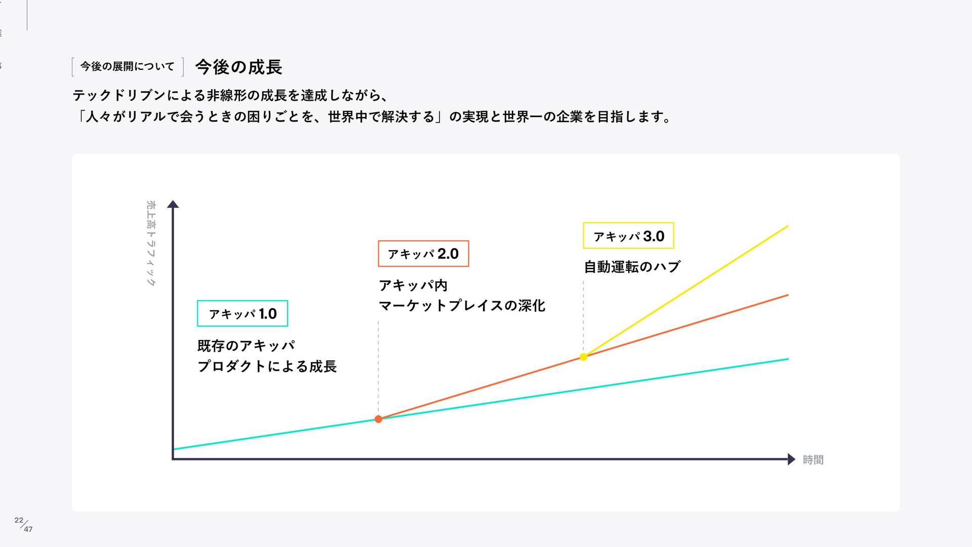 自動運転のハブ 売上高トラフィック 時間 テックドリブンによる非線形の成長を達成しながら、 「人々がリアルで会うときの困りごとを、世界中で解決する」の実現と世界一の企業を目指します。 今後の成長 今後の展開について 22 47 事 業 に つ い て