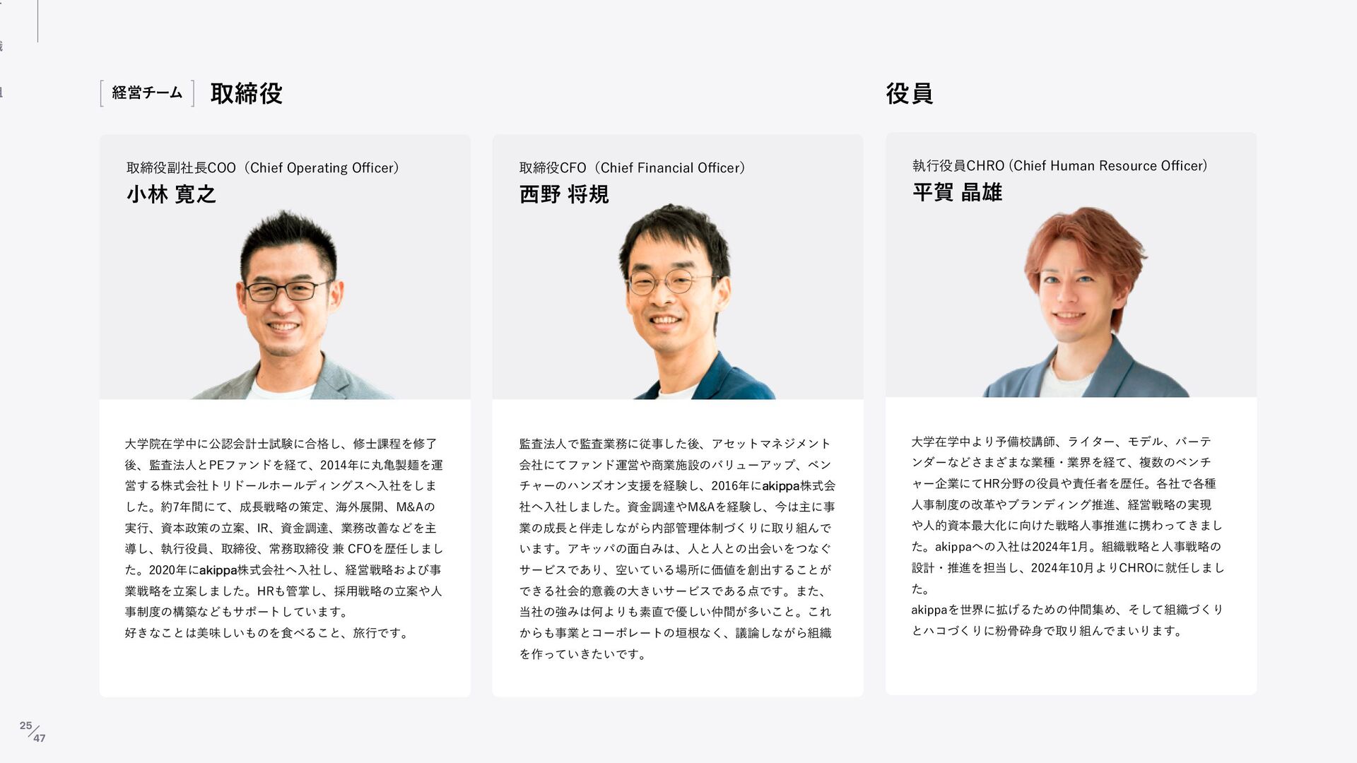 執行役員CHRO (Chief Human Resource Officer) 大学在学中より予備校講師、ライター、モデル、バーテ ンダーなどさまざまな業種・業界を経て、複数のベンチ ャー企業にてHR分野の役員や責任者を歴任。各社で各種 人事制度の改革やブランディング推進、経営戦略の実現 や人的資本最大化に向けた戦略人事推進に携わってきまし た。akippaへの入社は2024年1月。組織戦略と人事戦略の 設計・推進を担当し、2024年10月よりCHROに就任しまし た。 akippaを世界に拡げるための仲間集め、そして組織づくり とハコづくりに粉骨砕身で取り組んでまいります。 監査法人で監査業務に従事した後、アセットマネジメント 会社にてファンド運営や商業施設のバリューアップ、ベン チャーのハンズオン支援を経験し、2016年にakippa株式会 社へ入社しました。資金調達やM&Aを経験し、今は主に事 業の成長と伴走しながら内部管理体制づくりに取り組んで います。アキッパの面白みは、人と人との出会いをつなぐ サービスであり、空いている場所に価値を創出することが できる社会的意義の大きいサービスである点です。また、 当社の強みは何よりも素直で優しい仲間が多いこと。これ からも事業とコーポレートの垣根なく、議論しながら組織 を作っていきたいです。 西野 将規 取締役CFO(Chief Financial Officer) 大学院在学中に公認会計士試験に合格し、修士課程を修了 後、監査法人とPEファンドを経て、2014年に丸亀製麺を運 営する株式会社トリドールホールディングスへ入社をしま した。約7年間にて、成長戦略の策定、海外展開、M&Aの 実行、資本政策の立案、IR、資金調達、業務改善などを主 導し、執行役員、取締役、常務取締役 兼 CFOを歴任しまし た。2020年にakippa株式会社へ入社し、経営戦略および事 業戦略を立案しました。HRも管掌し、採用戦略の立案や人 事制度の構築などもサポートしています。 好きなことは美味しいものを食べること、旅行です。 25 47 組 織 に つ い て