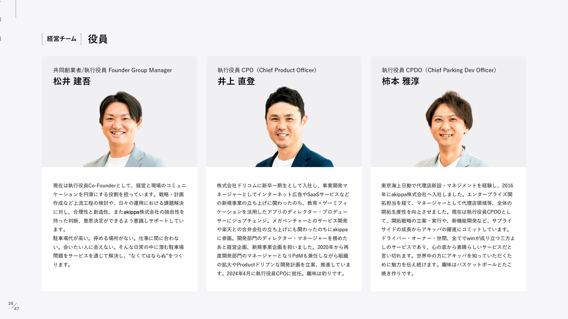 持った判断、意思決定ができるよう意識しサポートしてい ます。 駐車場代が高い。停める場所がない。仕事に間に合わな い。会いたい人に会えない。そんな日常の中に潜む駐車場 問題をサービスを通じて解決し、“なくてはならぬ”をつく ります。 役員 経営チーム 東京海上日動で代理店新設・マネジメントを経験し、2016 年にakippa株式会社へ入社しました。エンタープライズ開 拓担当を経て、マネージャーとして代理店領域等、全体の 開拓生産性を向上させました。現在は執行役員CPDOとし て、開拓戦略の立案・実行や、新機能開発など、サプライ サイドの成長からアキッパの躍進にコミットしています。 ドライバー・オーナー・世間、全てでwinが成り立つ三方よ しのサービスであり、心の底から素晴らしいサービスだと 言い切れます。世界中の方にアキッパを知っていただくた めに魅力を伝え続けます。趣味はバスケットボールとたこ 焼き作りです。 柿本 雅淳 執行役員 CPDO(Chief Parking Dev Officer) 執行役員 CPO(Chief Product Officer) 株式会社ドリコムに新卒一期生として入社し、事業開発マ ネージャーとしてインターネット広告やSaaSサービスなど の新規事業の立ち上げに関わったのち、教育×ゲーミフィ ケーションを活用したアプリのディレクター・プロデュー サーにジョブチェンジ。メガベンチャーとのサービス開発 や楽天との合弁会社の立ち上げにも関わったのちにakippa に参画。開発部門のディレクター・マネージャーを務めた あと経営企画、新規事業企画を担いました。2020年から再 度開発部門のマネージャーとなりPdMも兼任しながら組織 の拡大やProductドリブンな開発計画を立案、推進していま す。2024年4月に執行役員CPOに就任。趣味は釣りです。 井上 直登 26 47 組 織 に つ い て