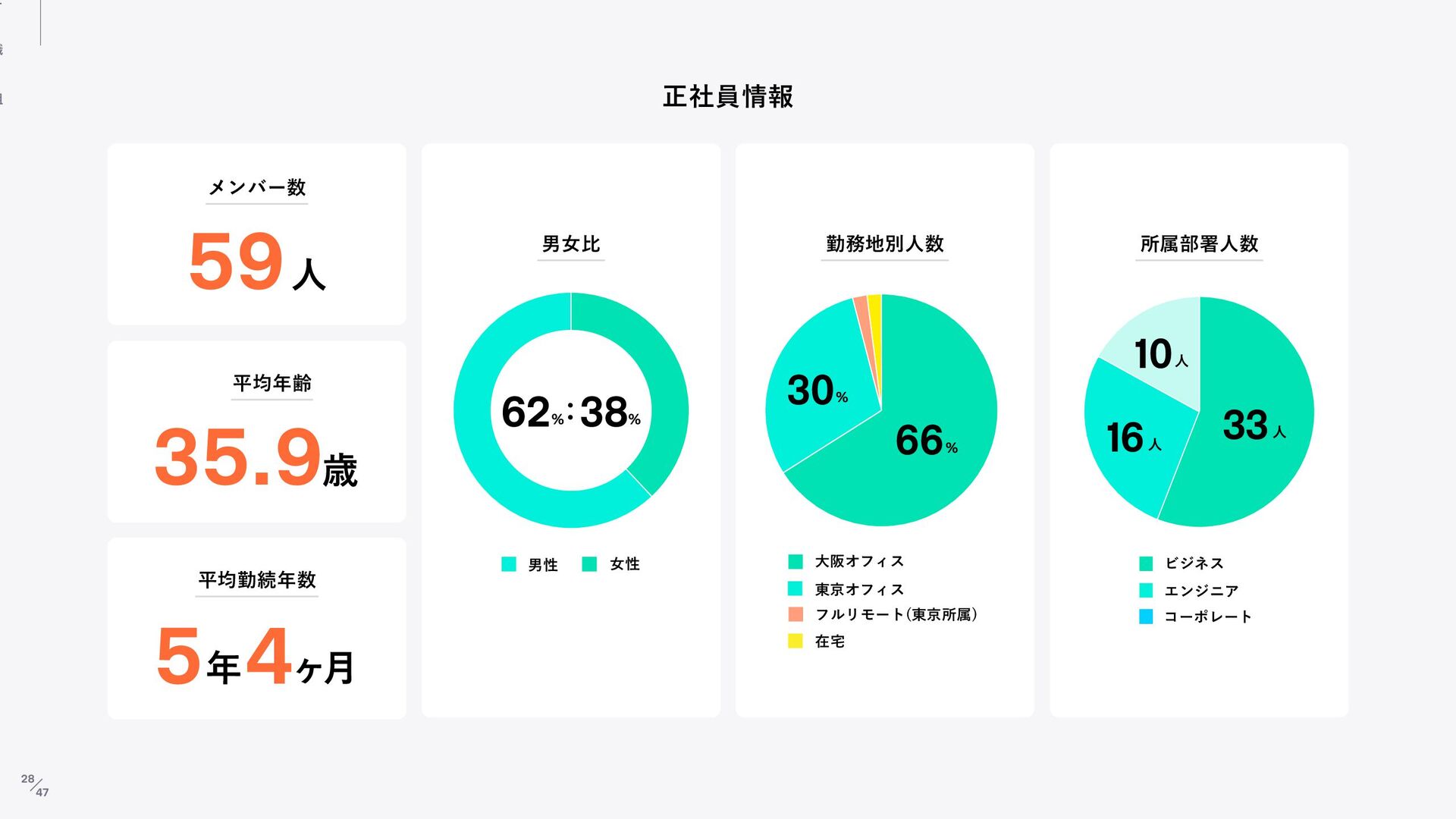 女性 % 50 50% 所属部署人数 エンジニア ビジネス コーポレート 45人 28人 32人 27 47 組 織 に つ い て