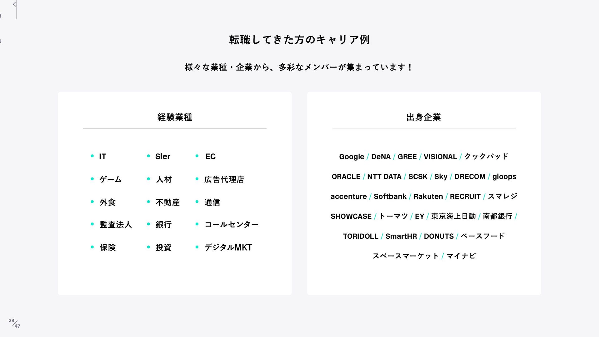 ORACLE / NTT DATA / SCSK / Sky / DRECOM / gloops accenture / Softbank / Rakuten / RECRUIT / スマレジ SHOWCASE / トーマツ / EY / 東京海上日動 / 南都銀行 / TORIDOLL / SmartHR / DONUTS / ベースフード スペースマーケット / マイナビ 様々な業種・企業から、多彩なメンバーが集まっています! IT Sler ゲーム EC 人材 広告代理店 外食 不動産 通信 監査法人 銀行 保険 投資 コールセンター デジタルMKT 経験業種 出身企業 29 47 働 く 環 境 に つ い て