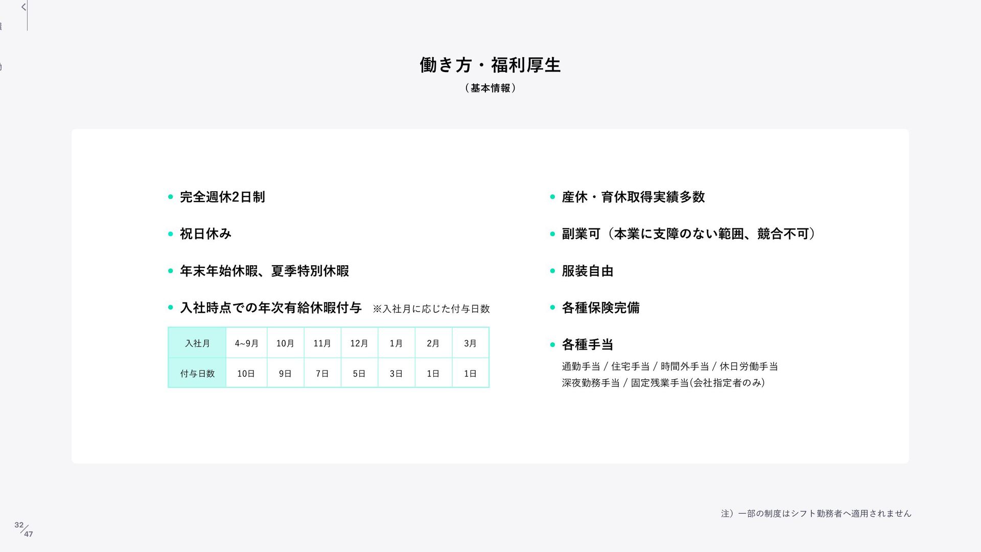 3月 1日 通勤手当 / 住宅手当 / 時間外手当 / 休日労働手当 深夜勤務手当 / 固定残業手当(会社指定者のみ) 完全週休2日制 祝日休み 年末年始休暇、夏季特別休暇 入社時点での年次有給休暇付与 ※入社月に応じた付与日数 入社月 付与日数 4~9月 10日 10月 9日 11月 7日 12月 5日 1月 3日 2月 1日 32 47 働 く 環 境 に つ い て
