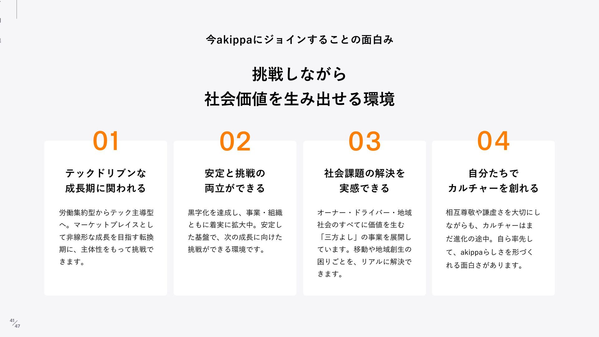 akippaの基本情報はもちろん、「akippaが社会に貢献できる価値とは?」「今のakippaにジョインするおもしろさは?」など盛りだくさんの内容です。