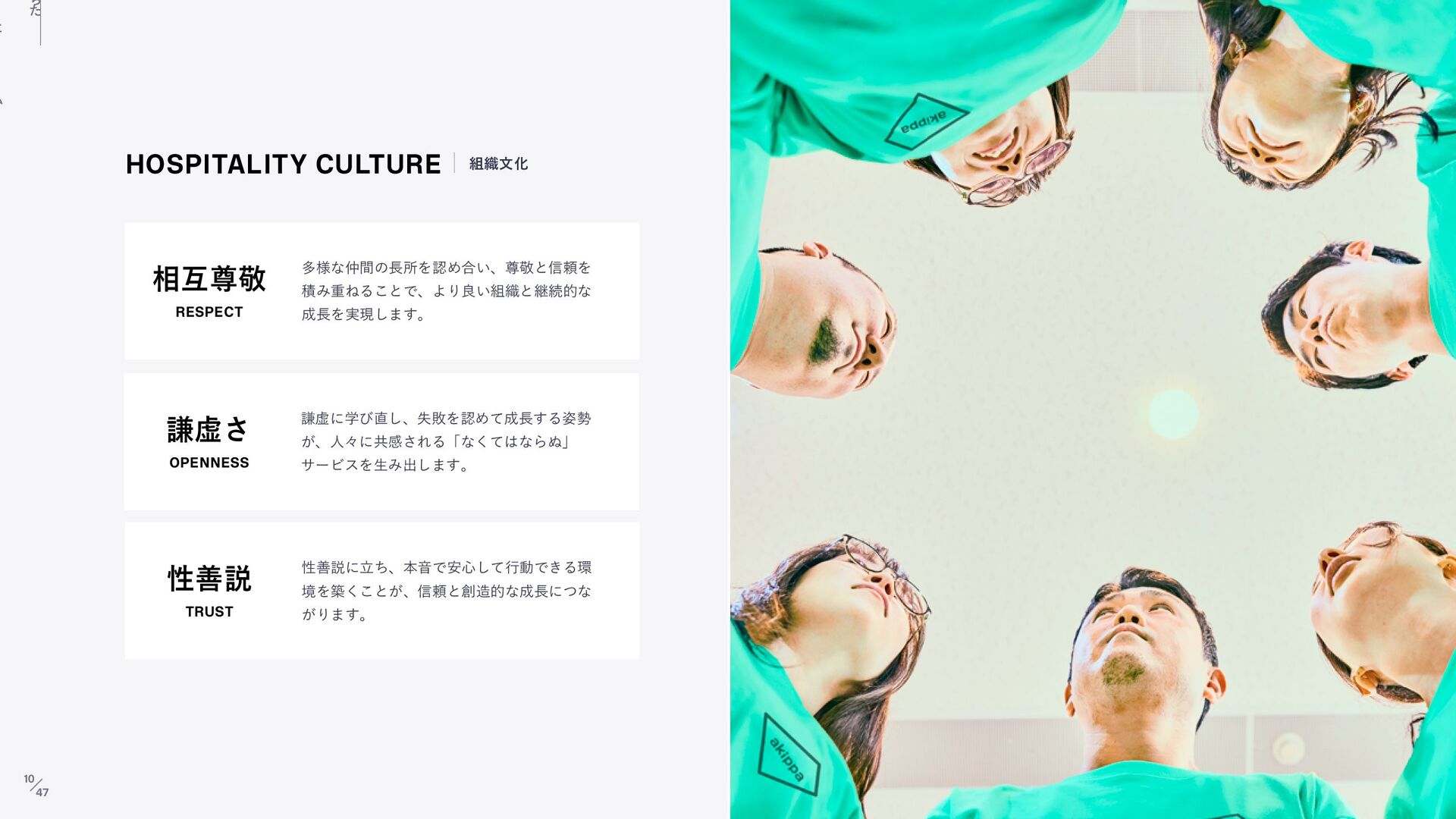 謙虚に学び直し、失敗を認めて成長する姿勢 が、人々に共感される「なくてはならぬ」 サービスを生み出します。 性善説 TRUST 性善説に立ち、本音で安心して行動できる環 境を築くことが、信頼と創造的な成長につな がります。 10 47 私 た ち に つ い て