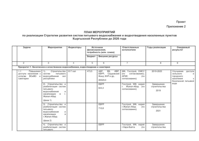 водоснабжения (сел - райцентров) 15 населенных пунктов АБР, ВБ, ЕБРР и др. 6286,5 Госстрой, ОМСУ (по согласованию) 2023 Улучшение доступа к системам водоснабжения 33) Реабилитация систем питьевого водоснабжения сел республики 567 сел АБР, ВБ, ИБР, ЕБРР, Саудовский Фонд, КНР и др. . 21205,0 МФ, Госстрой, ОМСУ (по согласованию), АРИС (по согласованию) 2026 Улучшение доступа к системам водоснабжения 34). Строительство и реабилитация объектов санитарии в социальных учреждениях Учреждения в 50 селах при ОМСУ ВБ, ЮНИСЕФ 40,312 ЮНИСЕФ, АРИС (по согласованию) 2023 Улучшение санитарии и гигиены в социальных учреждениях 35). Реализация проекта "Управление сточными водами Иссык-Куля" Города Балыкчы, Каракол АБР 2546,9 Госстрой, МФ, мэрии гг. Балыкчы, Каракол (по согласованию) 2023 Повышение качества очистки сточных вод и улучшение экологии 36). Реализация проекта "Управление сточными водами Иссык-Куля Город Чолпон- Ата АБР Госстрой, МФ, мэрия г. Чолпон-Ата, (по согласованию) 2023 Повышение качества очистки сточных вод и улучшение экологии 37). Реабилитация очистных сооружений и канализации гг.. Ташкомур, Талас, Токтогул, Кызыл-Кия, Кербен, Кемин Республика Польша 2092,2 МФ, Госстрой, мэрии городов 2023 Повышение качества очистки сточных вод и улучшение экологии 2 1.2 Обеспечение населения нормативной безопасной питьевой водой 1). Организовать три производственные и одну передвижную лаборатории ДРПВВО для производственного контроля безопасной питьевой воды сельских населенных Количество производственн ых и передвижных лабораторий ЕБРР 209,0 Госстрой, МФ, М3 4 лаборатории Оборудованы и функционируют три производственные лаборатории и одна передвижная лаборатория