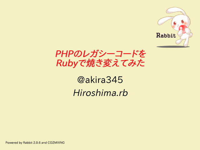 PHPのレガシーコードを Rubyで焼き変えてみた PHPのレガシーコードを Rubyで焼き変えてみた @akira345 Hiroshima.rb Powered by Rabbit 2.0.6