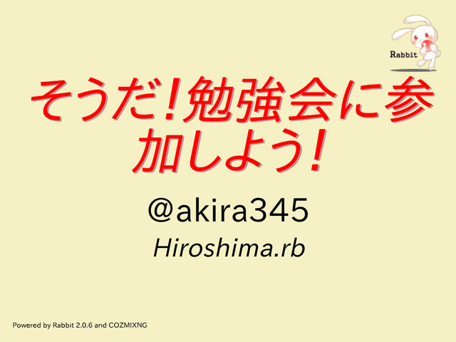 そうだ!勉強会に参 加しよう! そうだ!勉強会に参 加しよう! @akira345 Hiroshima.rb Powered by Rabbit 2.0.6