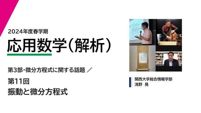 + ϕ) x′ = − Aω0 sin(ω0 t + ϕ) x(0) = A cos ϕ = 0 x′ (0) = − Aω0 sin ϕ = v 一般解 問題に示された初期値によると より cos ϕ = 0 ϕ = π 2 にできる sin ϕ = 1 このとき −Aω0 = v つまり A = − v ω0 以上から,求める特殊解は x = − v ω0 cos(ω0 t + π 2 ) すなわち x = v ω0 sin ω0 t