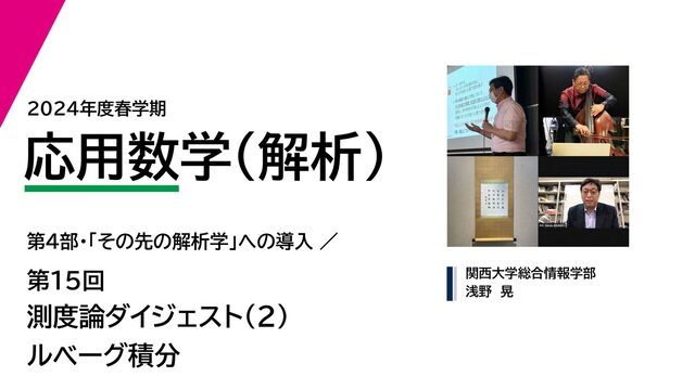 y A f(x)m(dx) = sup A ϕ(x)m(dx) ) 「 ( ) ( ) を たすす (k + 1)/2n |f(x) − ϕn(x)| ≤ 1 2n y yi x yi+1 Ai Ai = {a|yi f(a) < yi+1} したも 分割を細かくし で0 n → ∞ 単関数が に 各点収束する f(x)